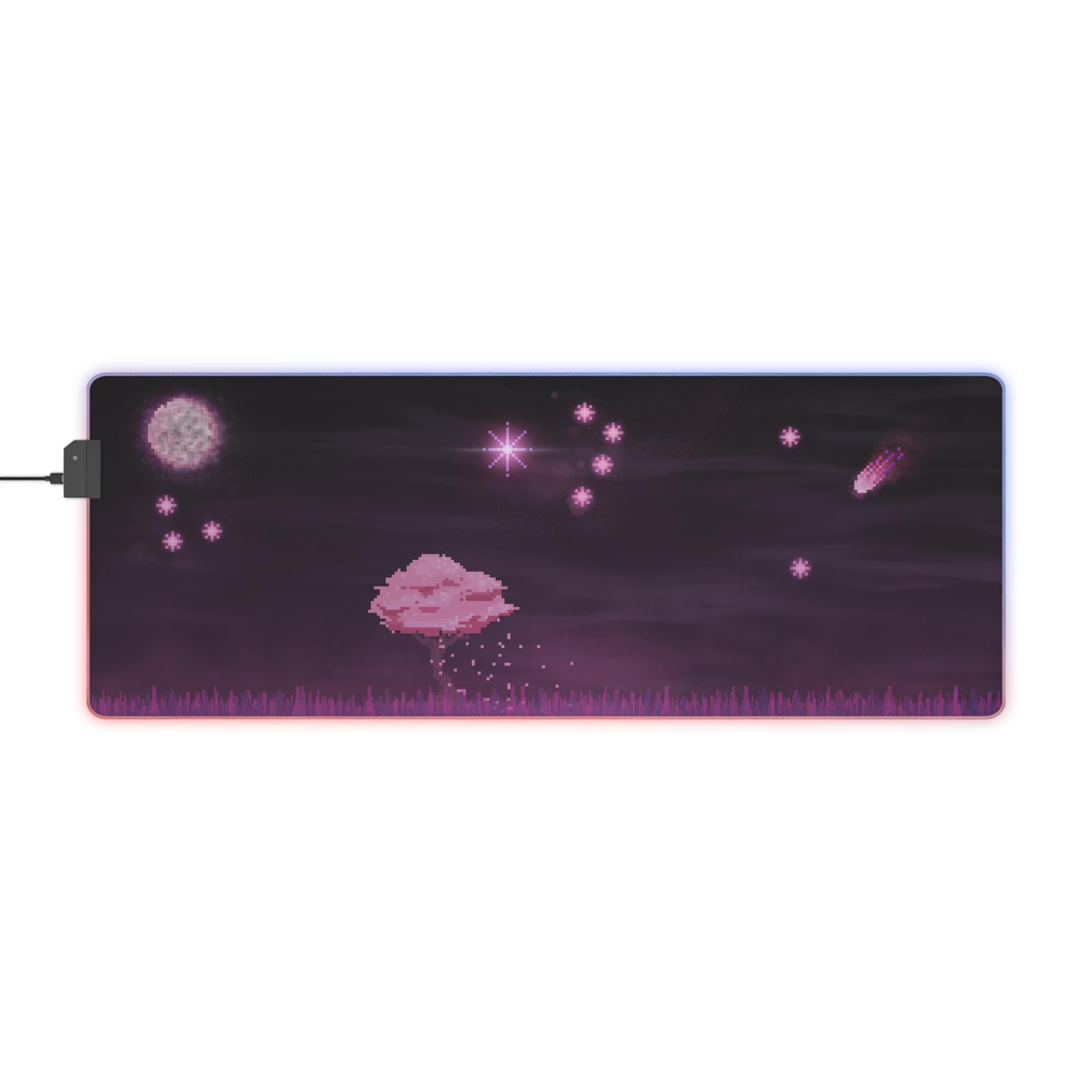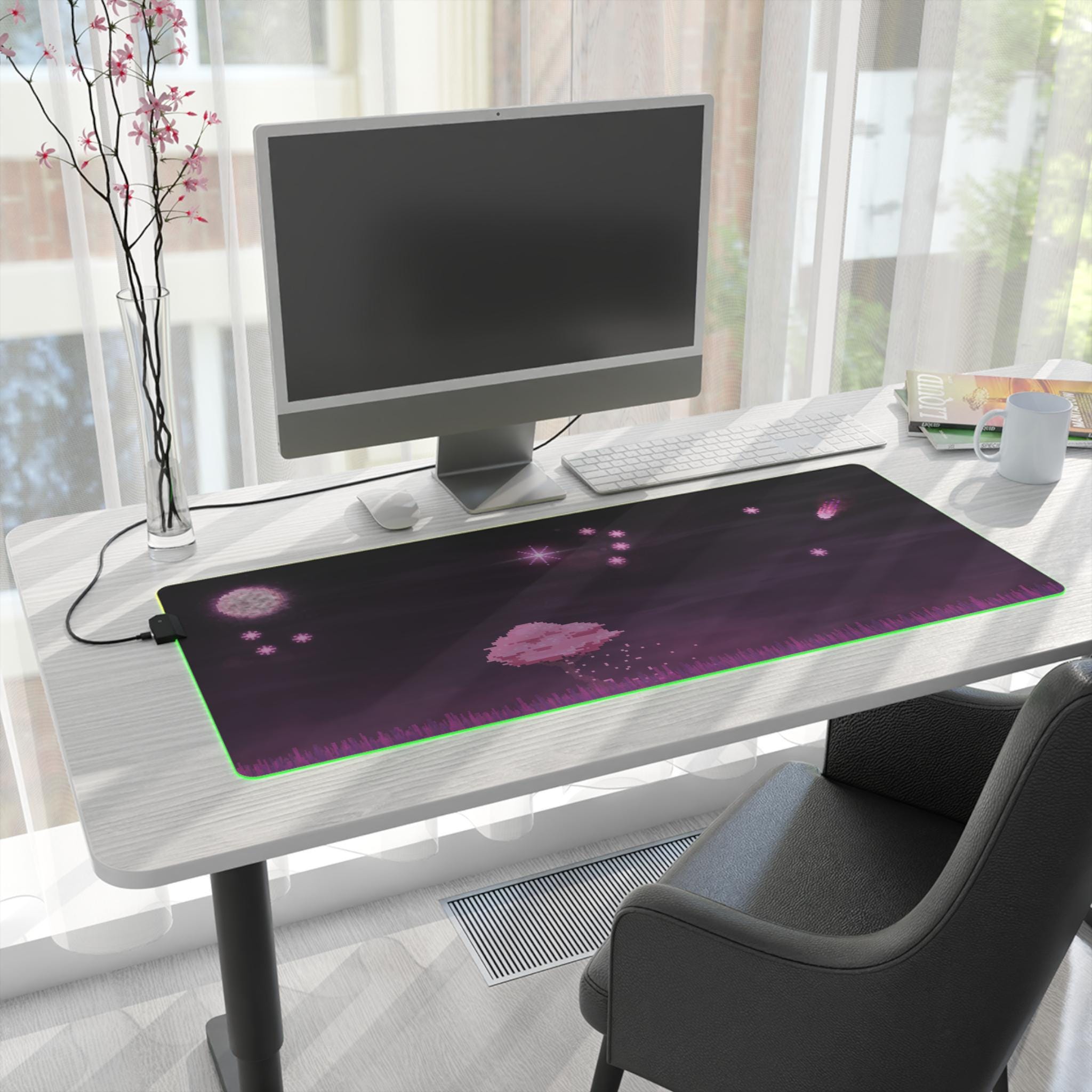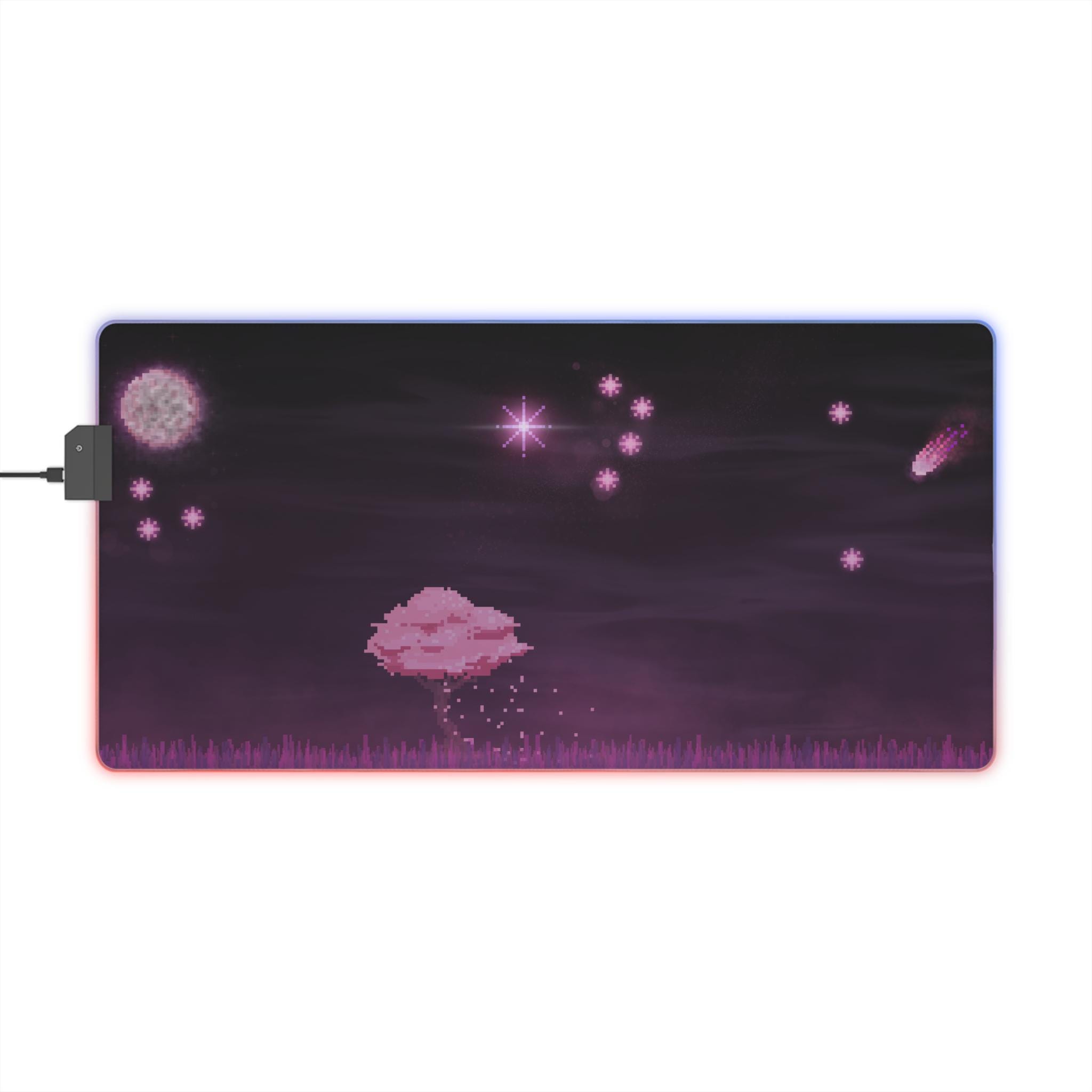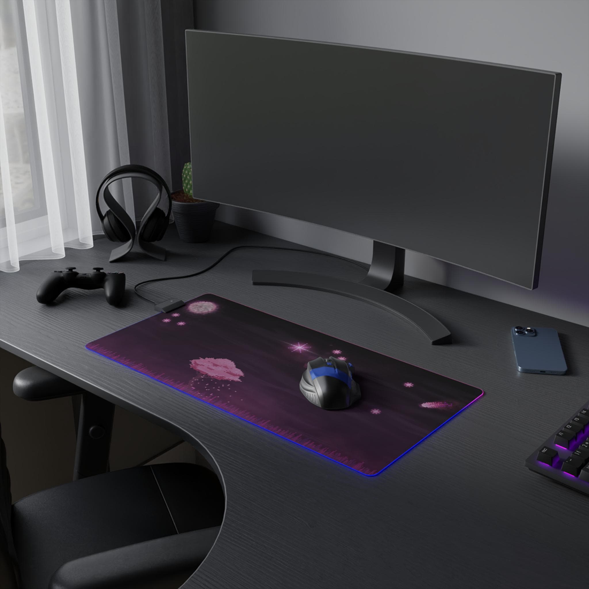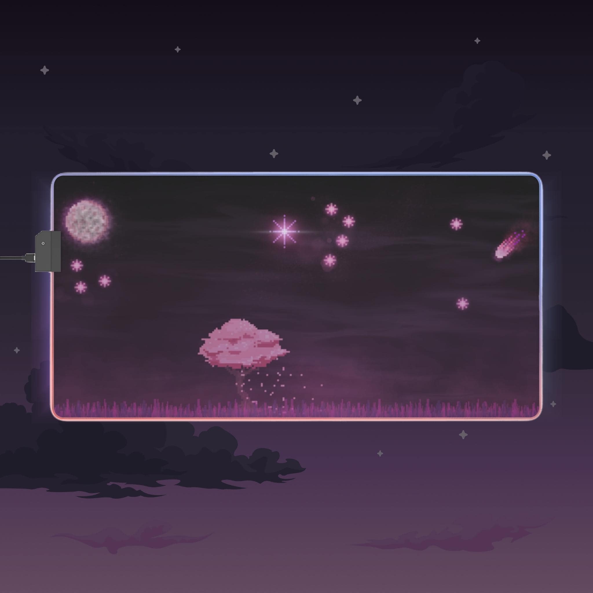 Sink into late-night focus with this LED gaming mouse pad that blends soft visuals and immersive lighting. A dusky, star-speckled scene stretches across a smooth polyester surface, while a full-edge LED strip casts adjustable color around your desk — from cool blues to warm pinks. The wide format gives space for mouse and keyboard movement, and the non-slip rubber base keeps the pad steady during intense sessions. Plug in via the detachable micro USB cable, pick a color that matches your setup, and let the gentle glow frame your play or work.