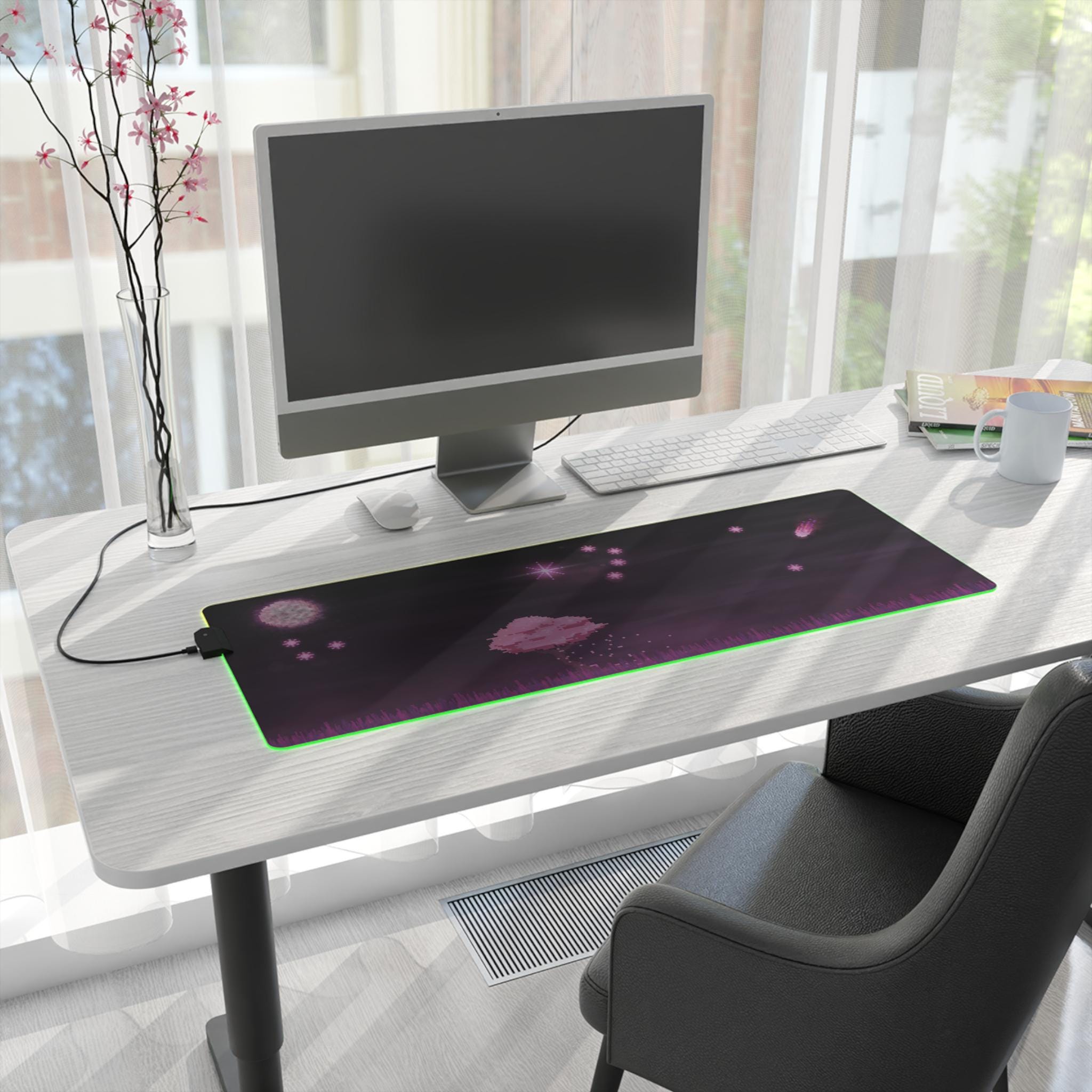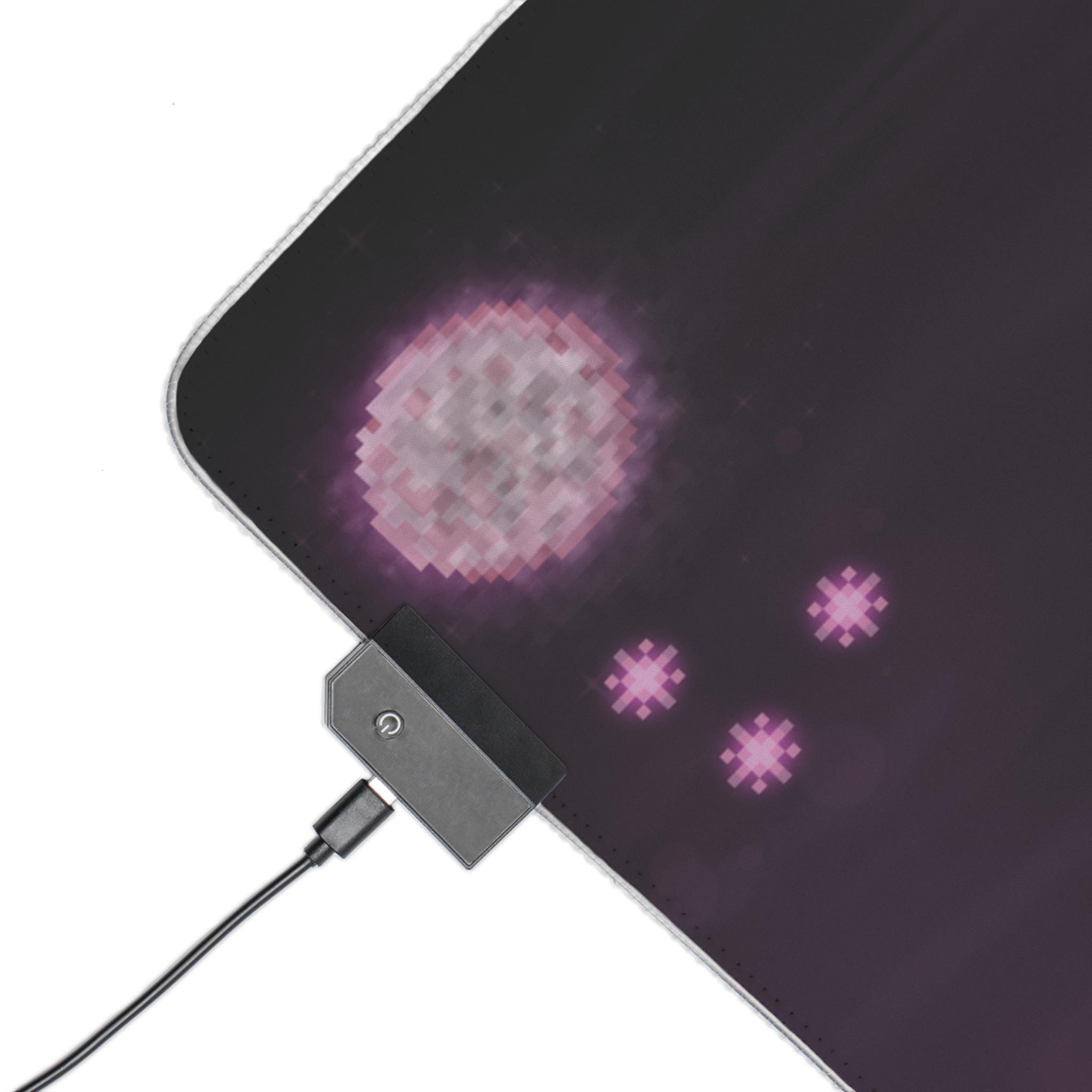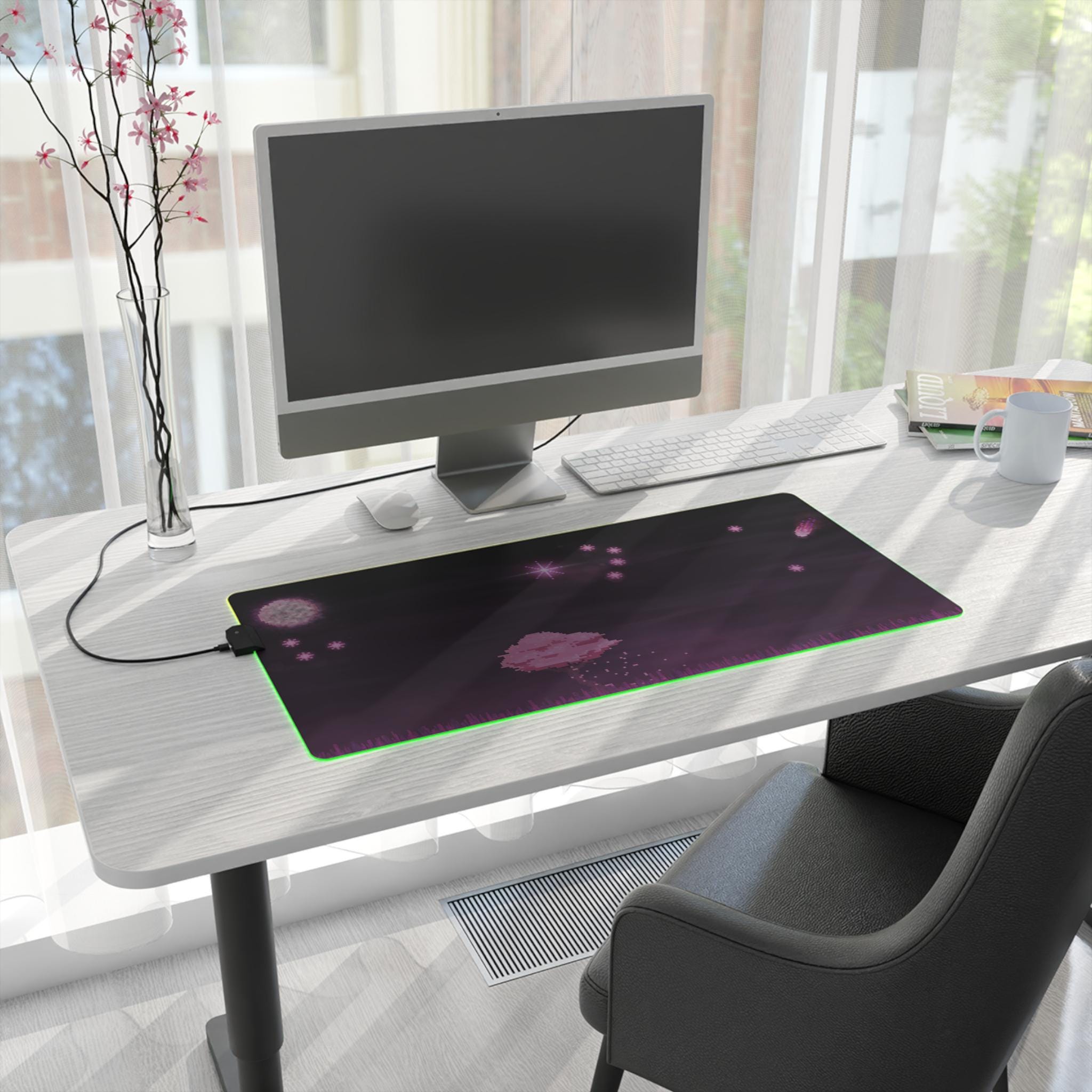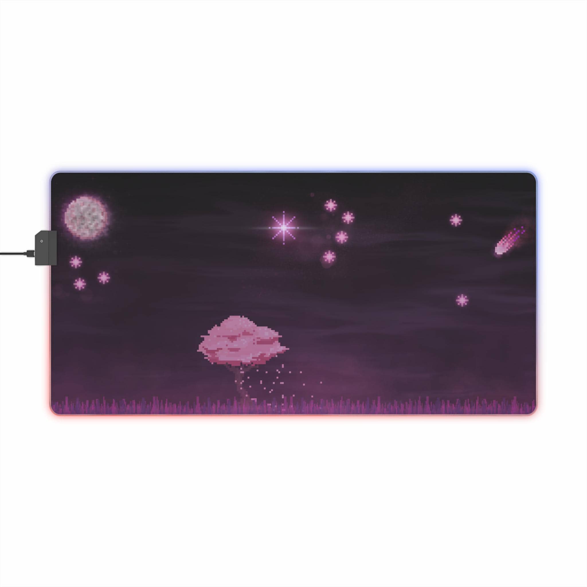 Sink into late-night focus with this LED gaming mouse pad that blends soft visuals and immersive lighting. A dusky, star-speckled scene stretches across a smooth polyester surface, while a full-edge LED strip casts adjustable color around your desk — from cool blues to warm pinks. The wide format gives space for mouse and keyboard movement, and the non-slip rubber base keeps the pad steady during intense sessions. Plug in via the detachable micro USB cable, pick a color that matches your setup, and let the gentle glow frame your play or work.