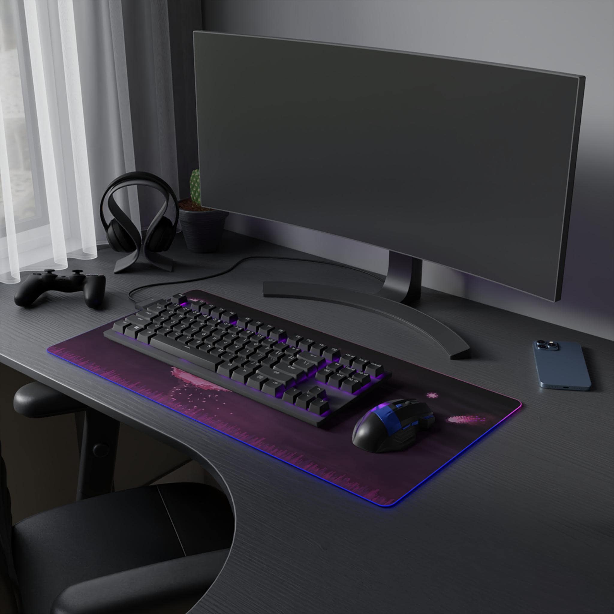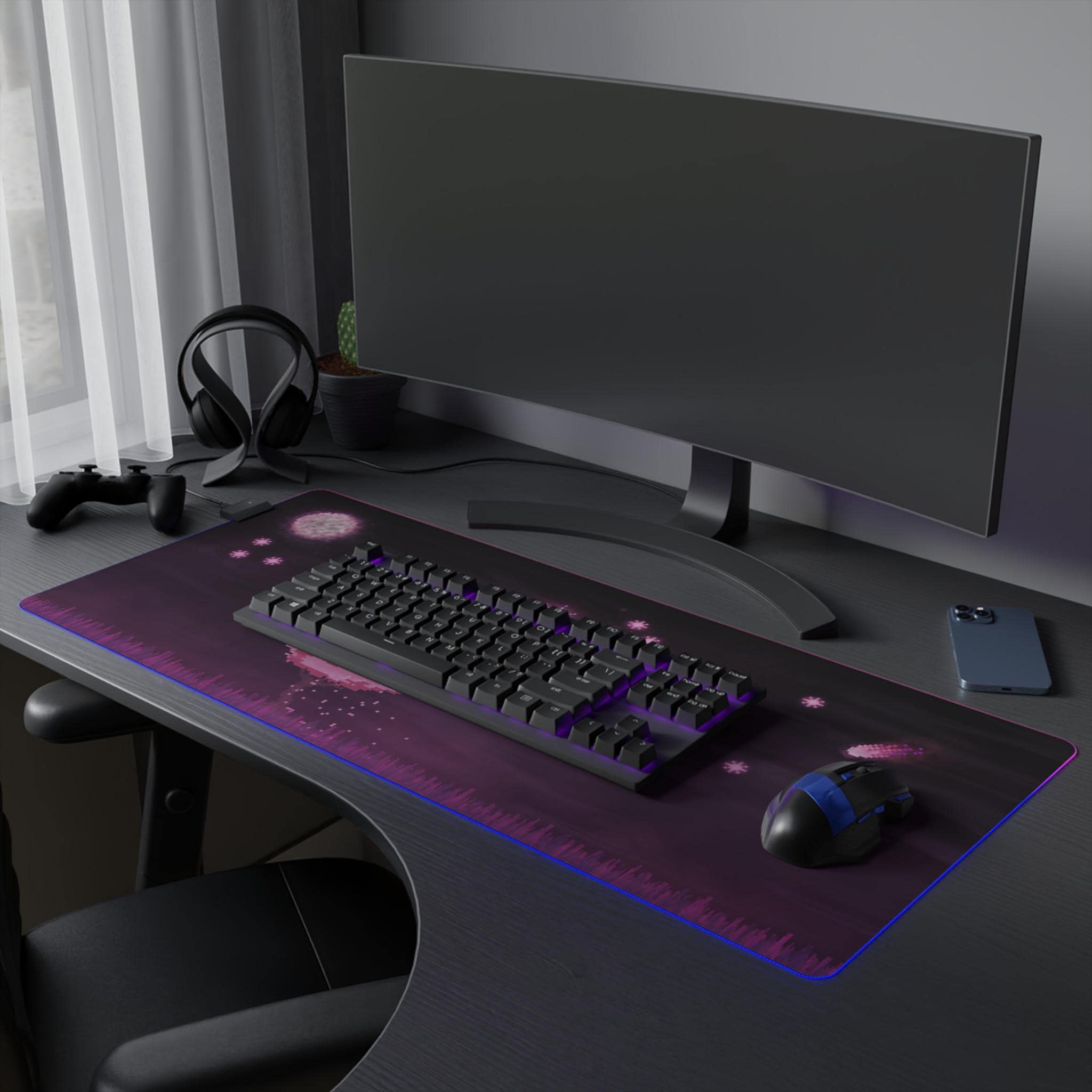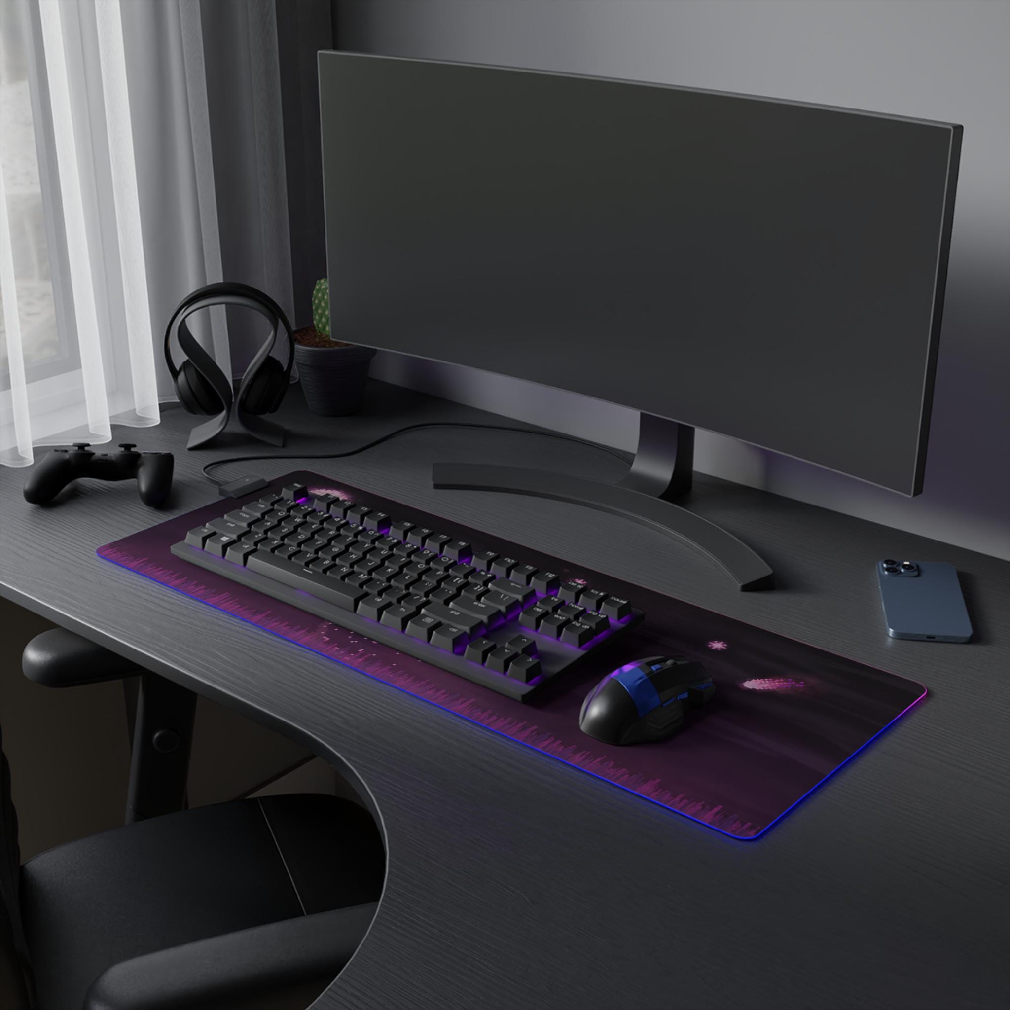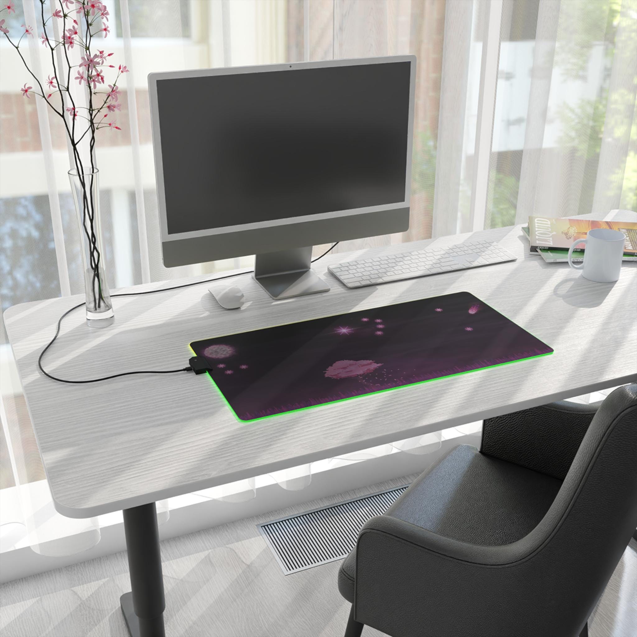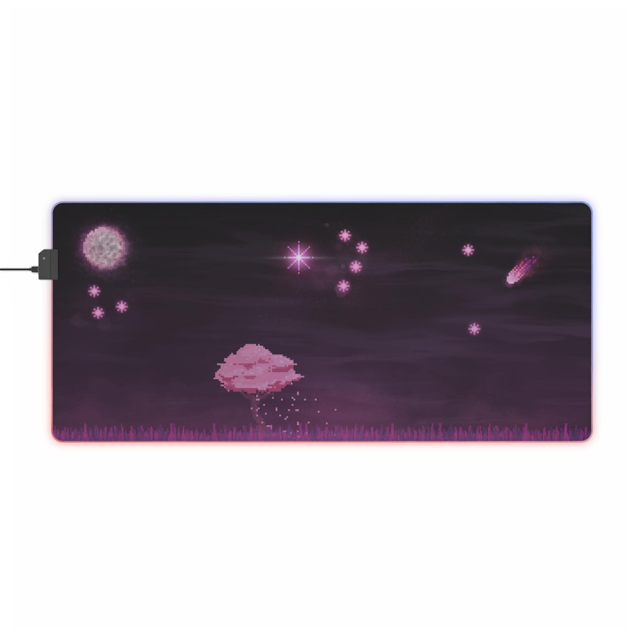 Sink into late-night focus with this LED gaming mouse pad that blends soft visuals and immersive lighting. A dusky, star-speckled scene stretches across a smooth polyester surface, while a full-edge LED strip casts adjustable color around your desk — from cool blues to warm pinks. The wide format gives space for mouse and keyboard movement, and the non-slip rubber base keeps the pad steady during intense sessions. Plug in via the detachable micro USB cable, pick a color that matches your setup, and let the gentle glow frame your play or work.
