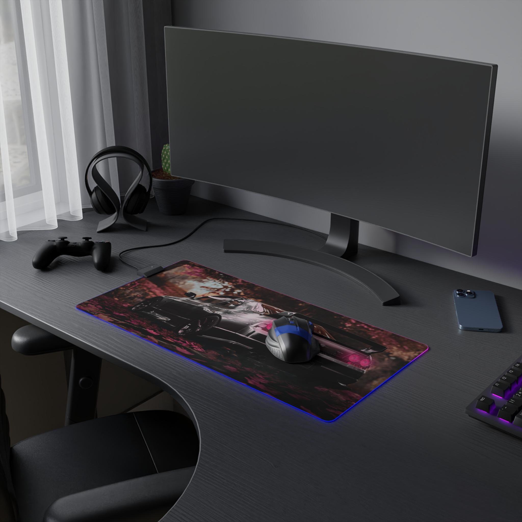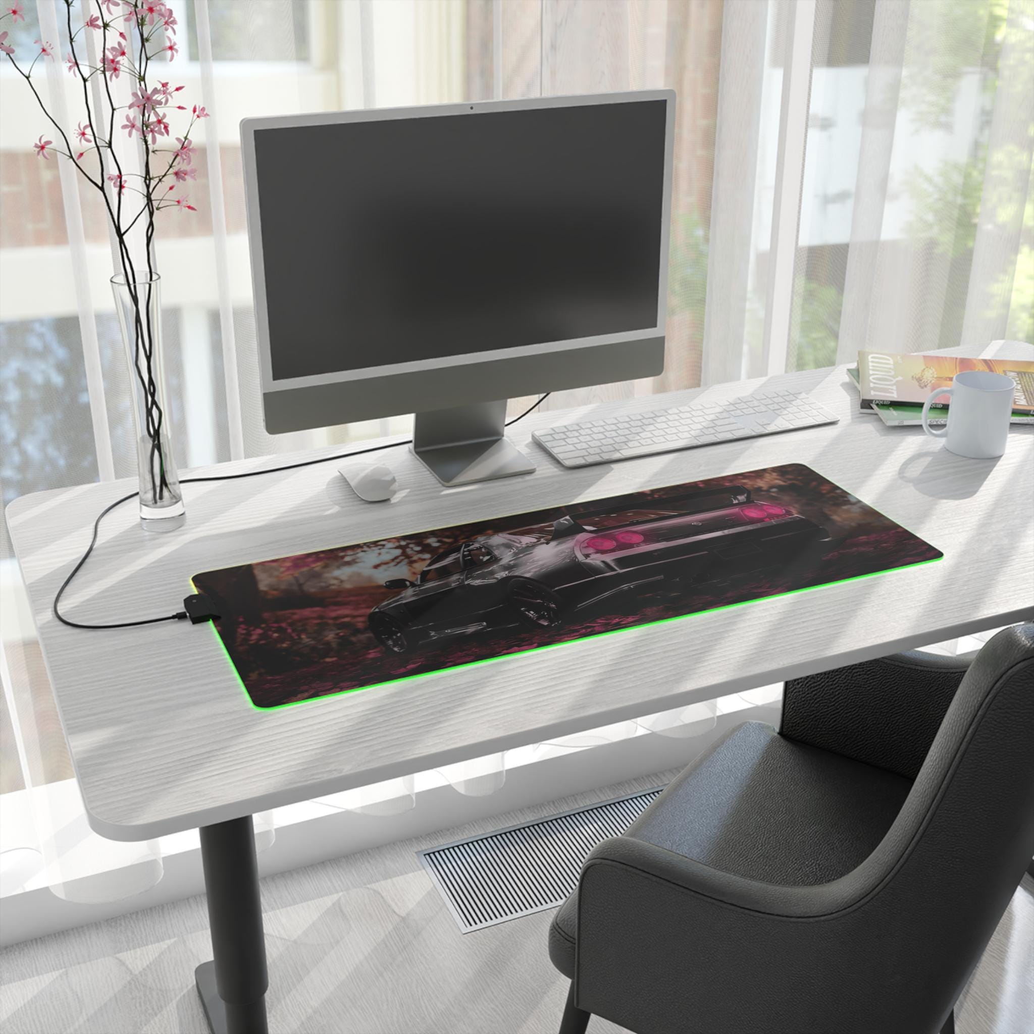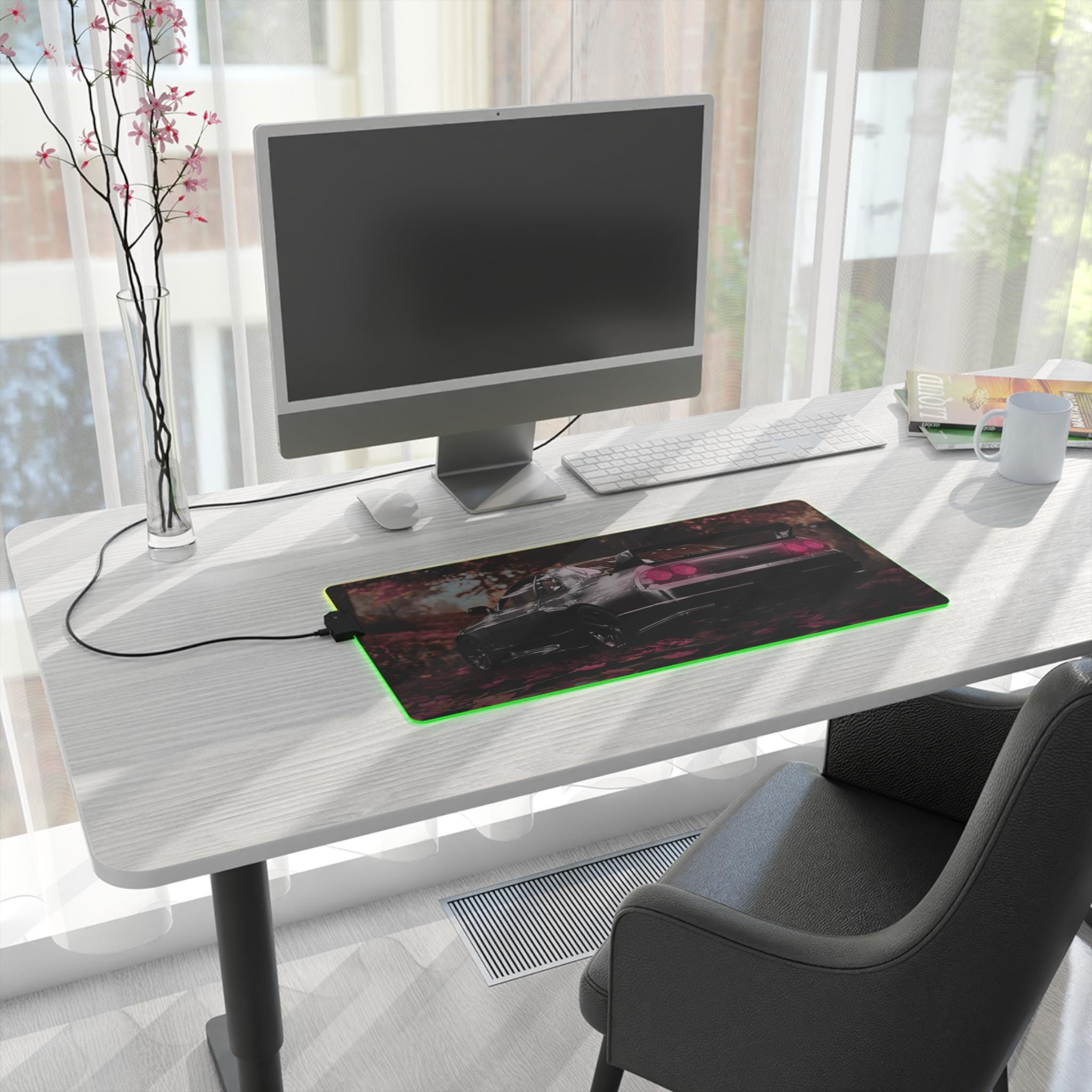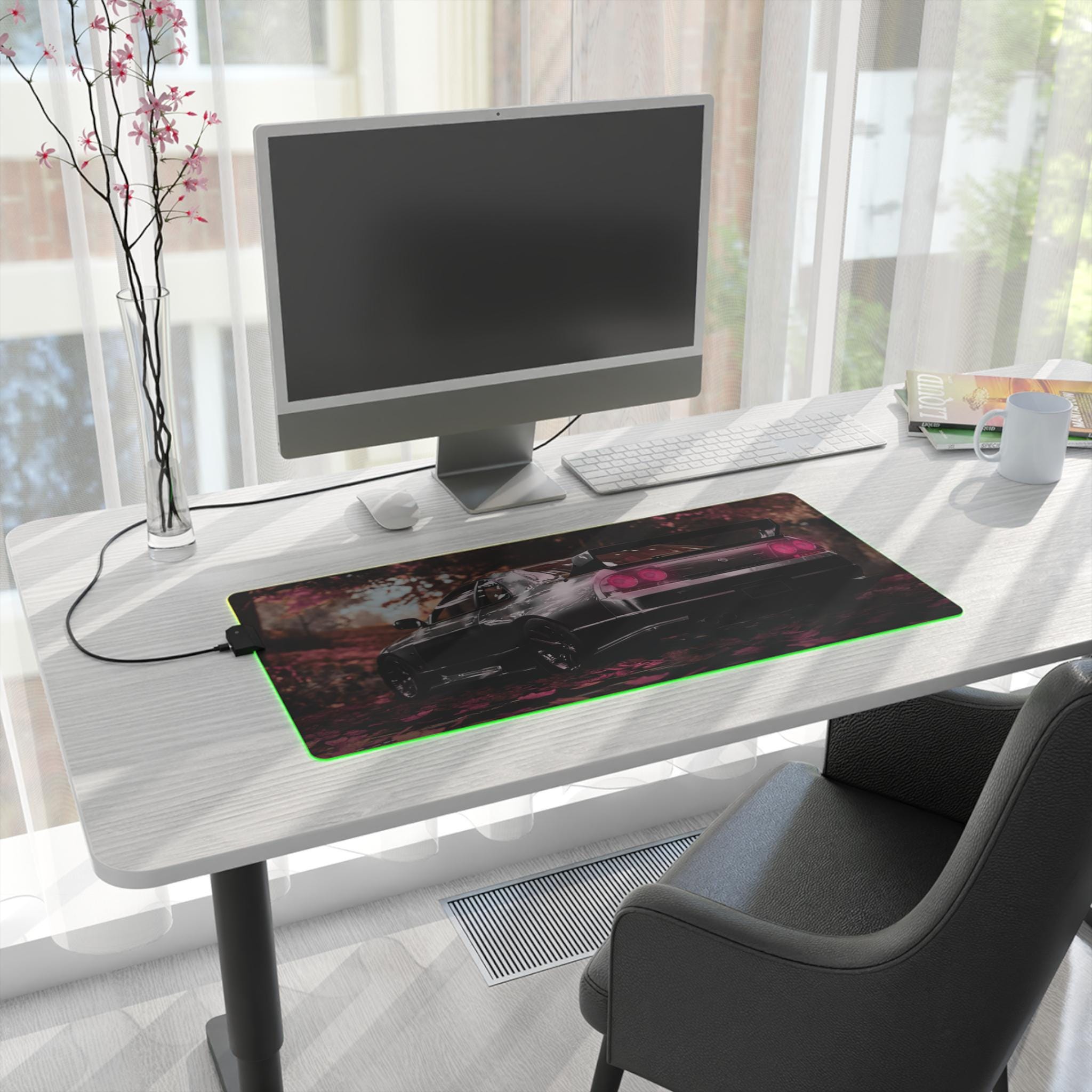 Wake up your desktop with an LED gaming mouse pad that blends fast, smooth tracking with mood lighting. The printed surface keeps colors vibrant so detailed artwork — like a midnight-modified skyline ride — stays sharp while your mouse glides. Around the edge, an RGB LED strip adds low-profile ambient lighting you can switch between rich reds, blues, greens, purples, yellows and white to match your setup or late-night vibe. The low-friction polyester top and non-slip rubber base make it great for marathon sessions, and the detachable USB connector and included micro USB cable keep setup simple and tidy.