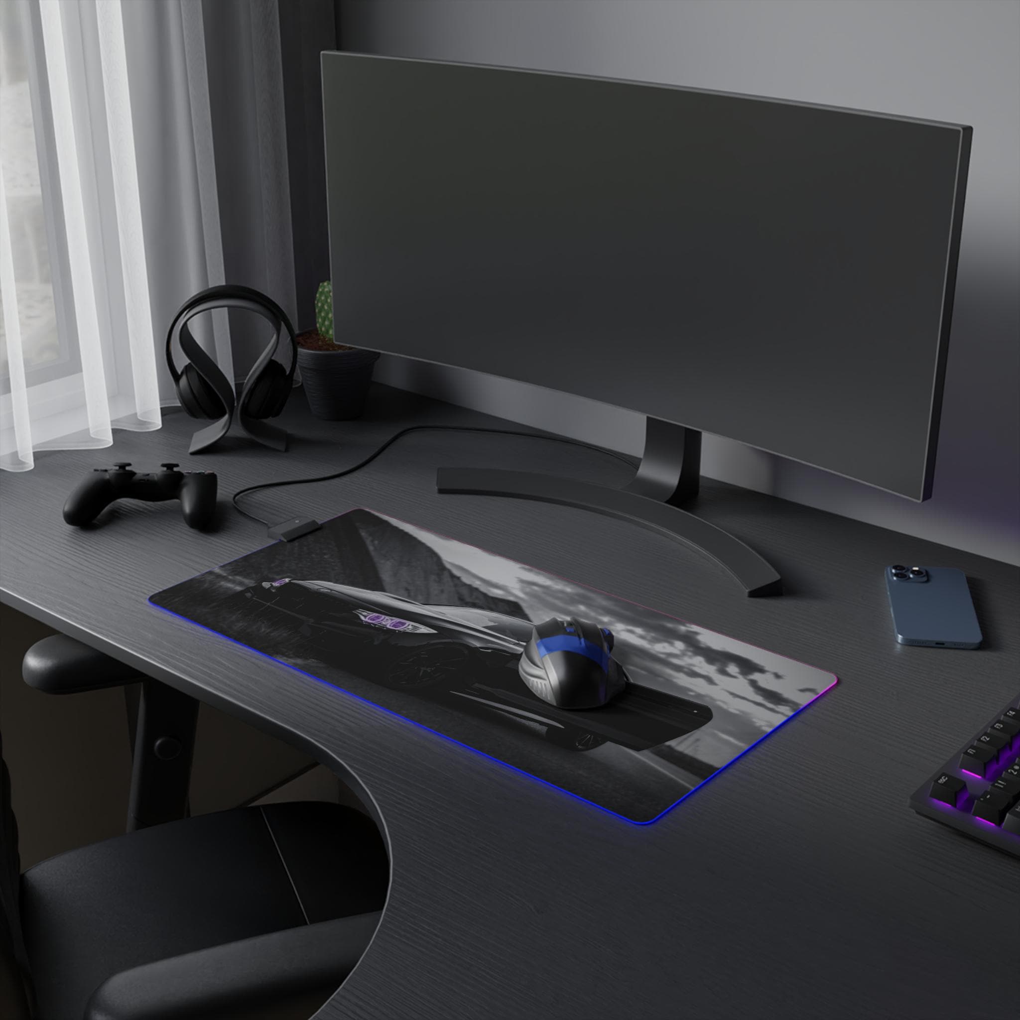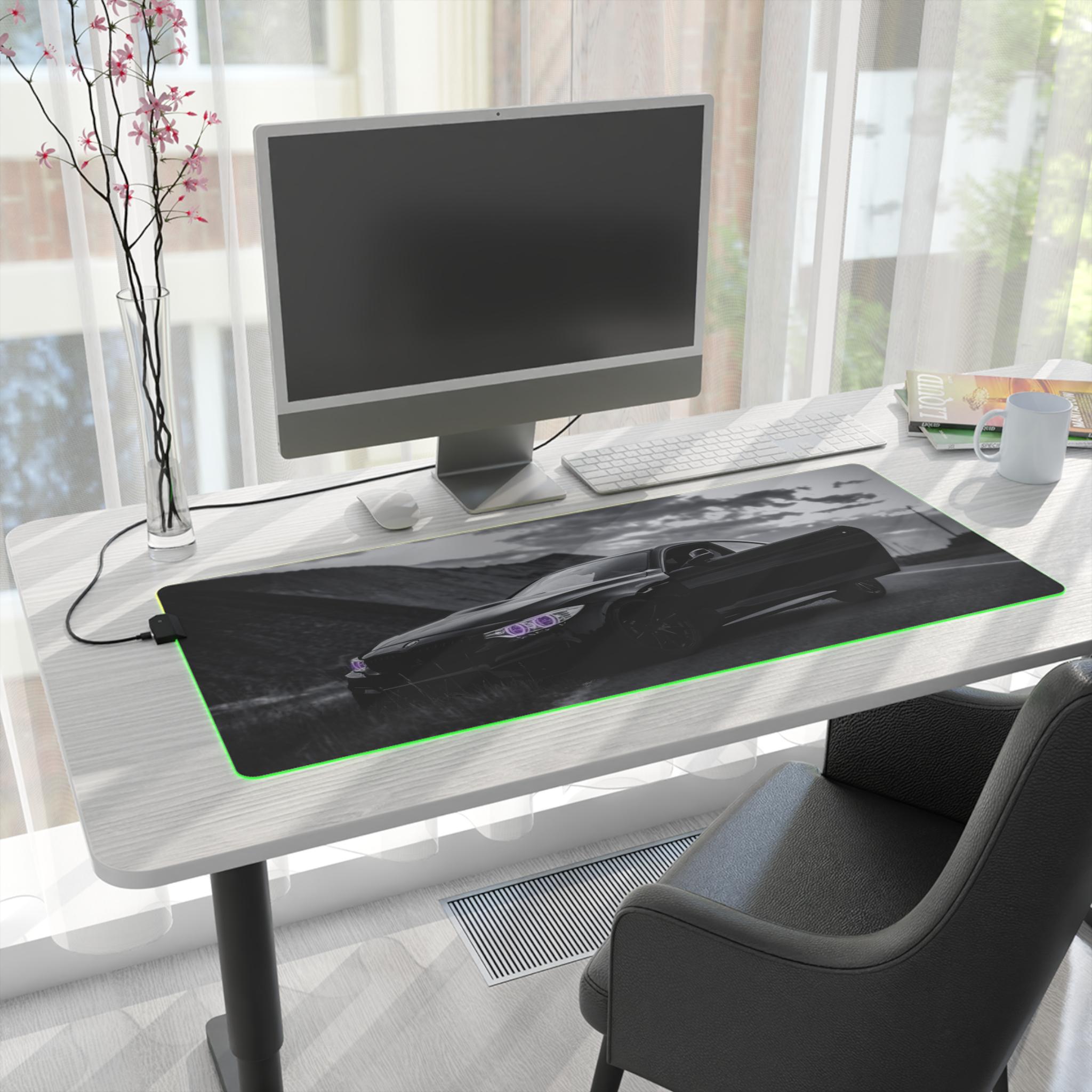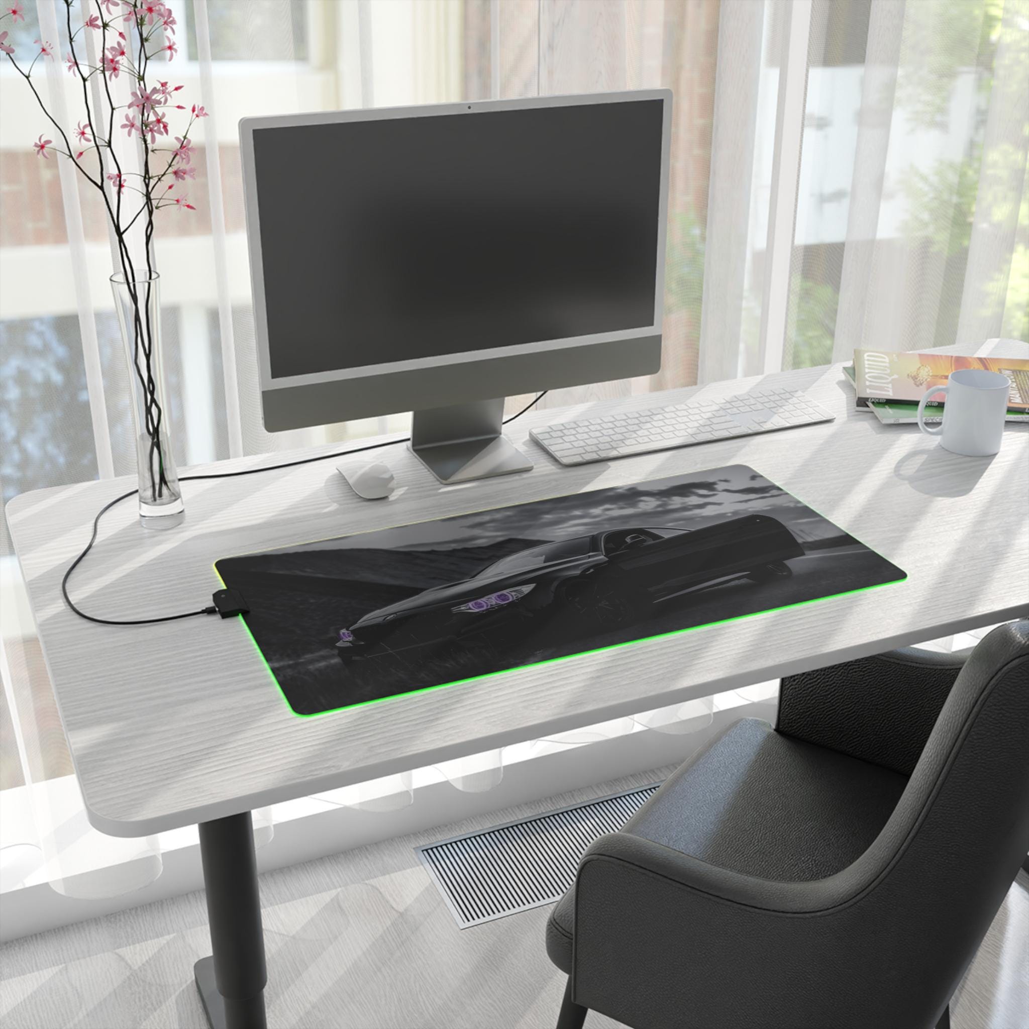 A wide, plush LED gaming mouse pad that turns a desk into a mood-lit cockpit. The smooth polyester surface tracks every flick with pixel-perfect consistency, while the soft rubber base keeps the pad locked in place during intense sessions. Edge-mounted RGB lighting wraps around the pad and cycles through vivid hues — or locks to a single shade — so your setup reads dark and sleek or neon and alive. The removable USB connector and included micro USB cable make swapping peripherals simple, and the durable print keeps high-contrast designs sharp even after long use. Slide a mechanical keyboard and mouse onto it and feel the room quiet down as the lights and image pull focus.