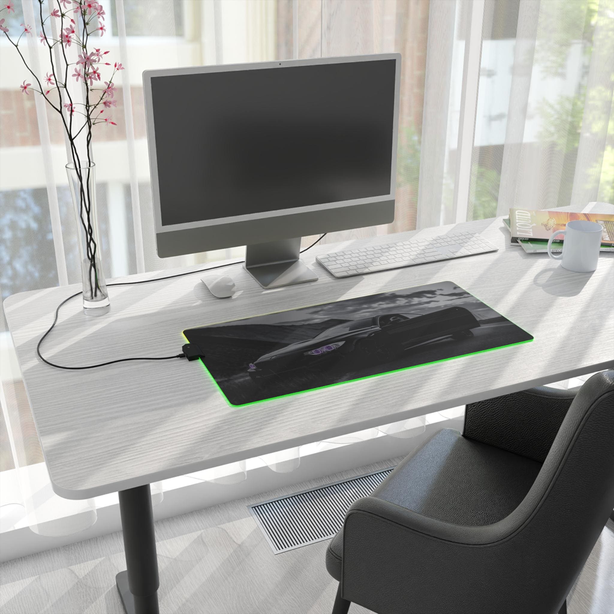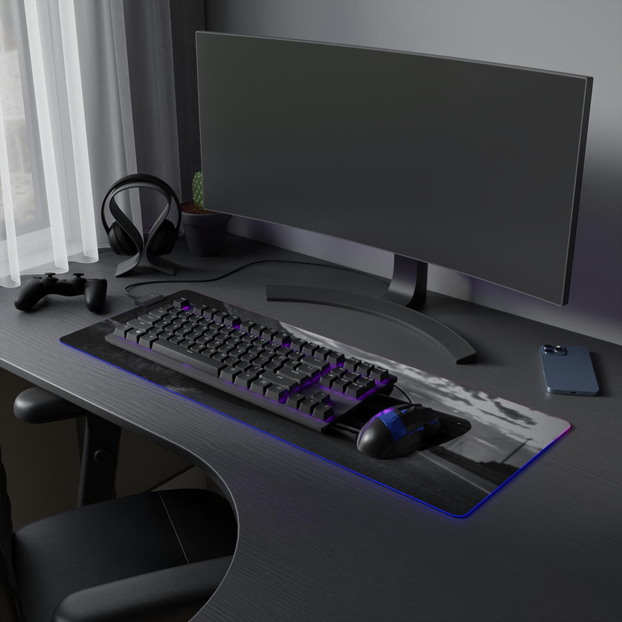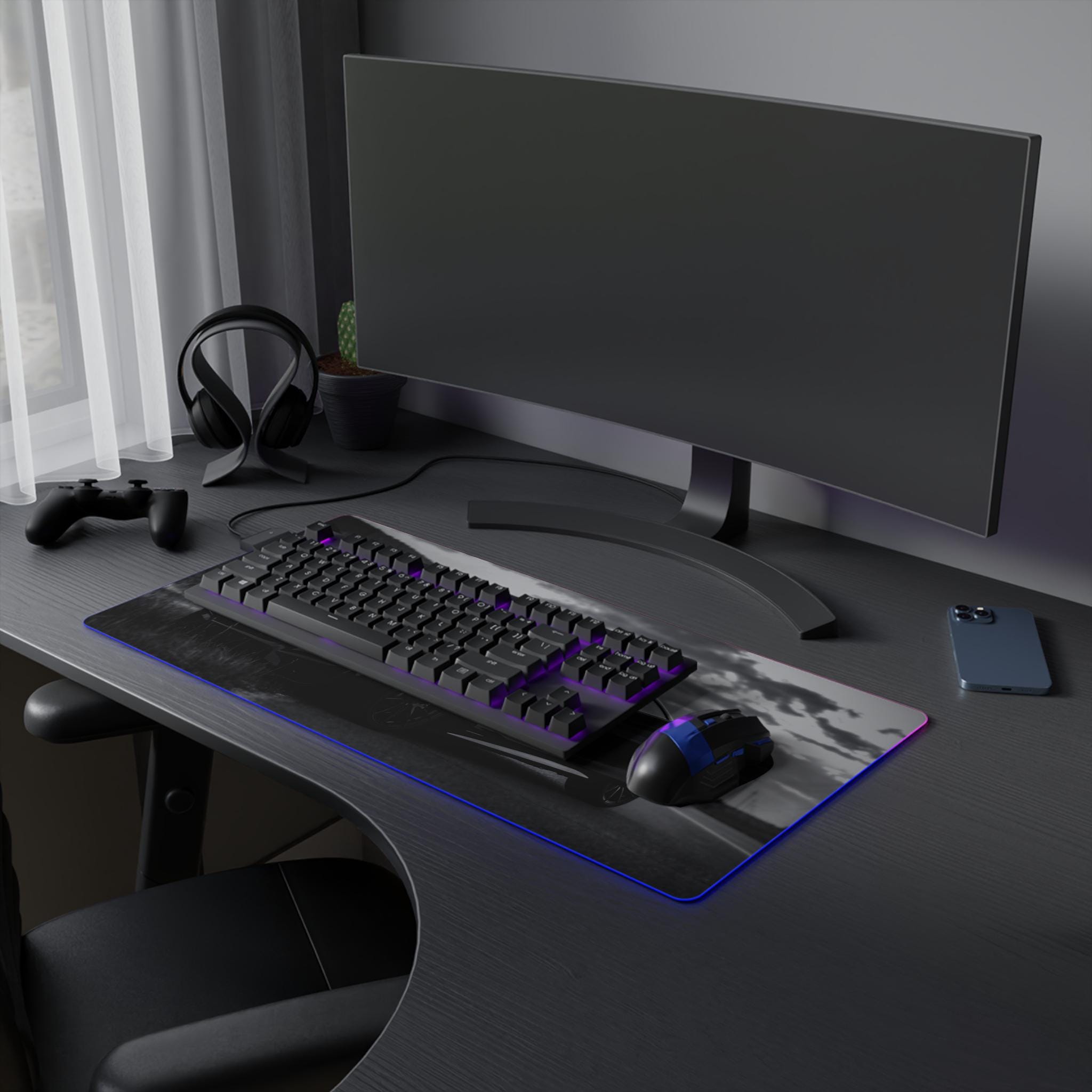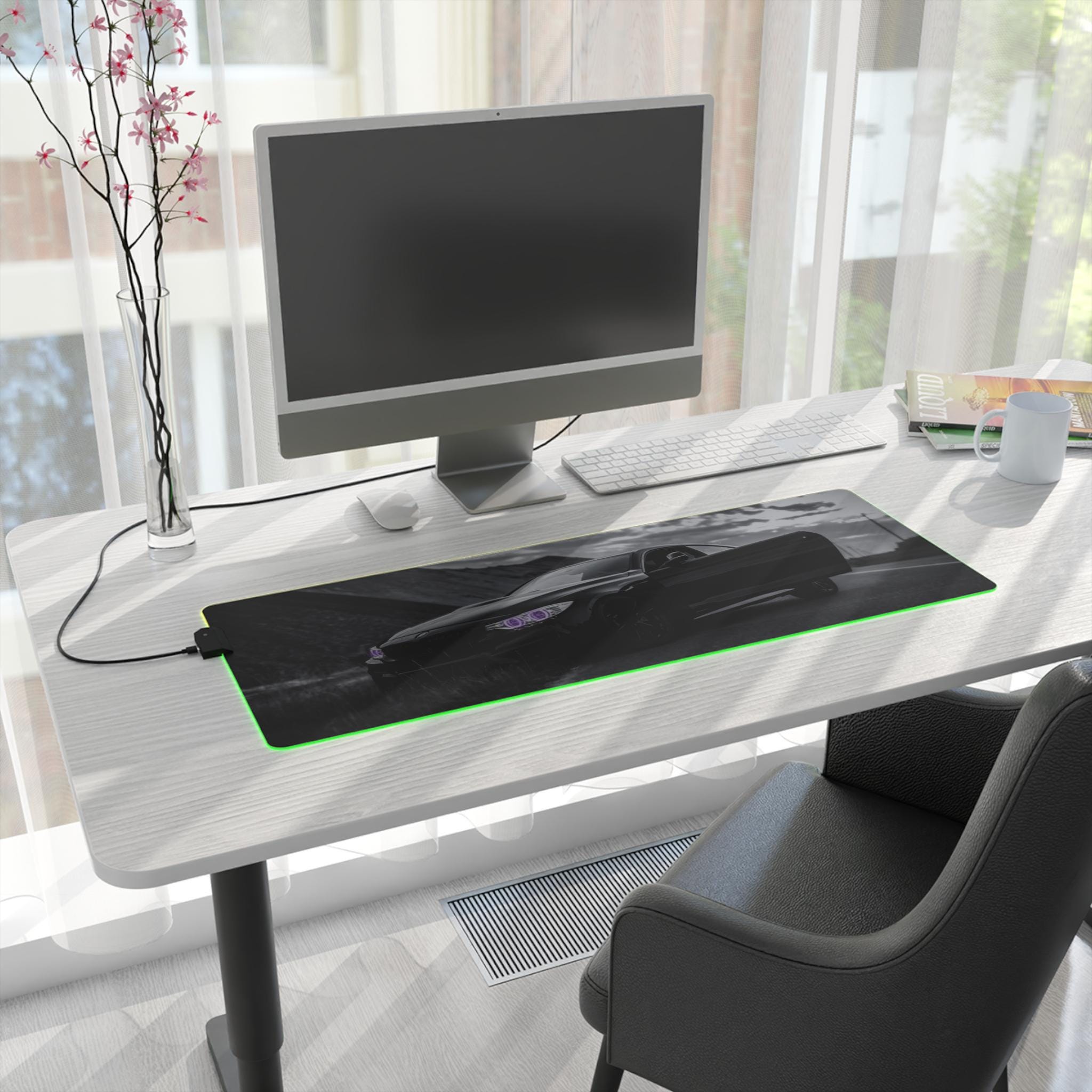 A wide, plush LED gaming mouse pad that turns a desk into a mood-lit cockpit. The smooth polyester surface tracks every flick with pixel-perfect consistency, while the soft rubber base keeps the pad locked in place during intense sessions. Edge-mounted RGB lighting wraps around the pad and cycles through vivid hues — or locks to a single shade — so your setup reads dark and sleek or neon and alive. The removable USB connector and included micro USB cable make swapping peripherals simple, and the durable print keeps high-contrast designs sharp even after long use. Slide a mechanical keyboard and mouse onto it and feel the room quiet down as the lights and image pull focus.