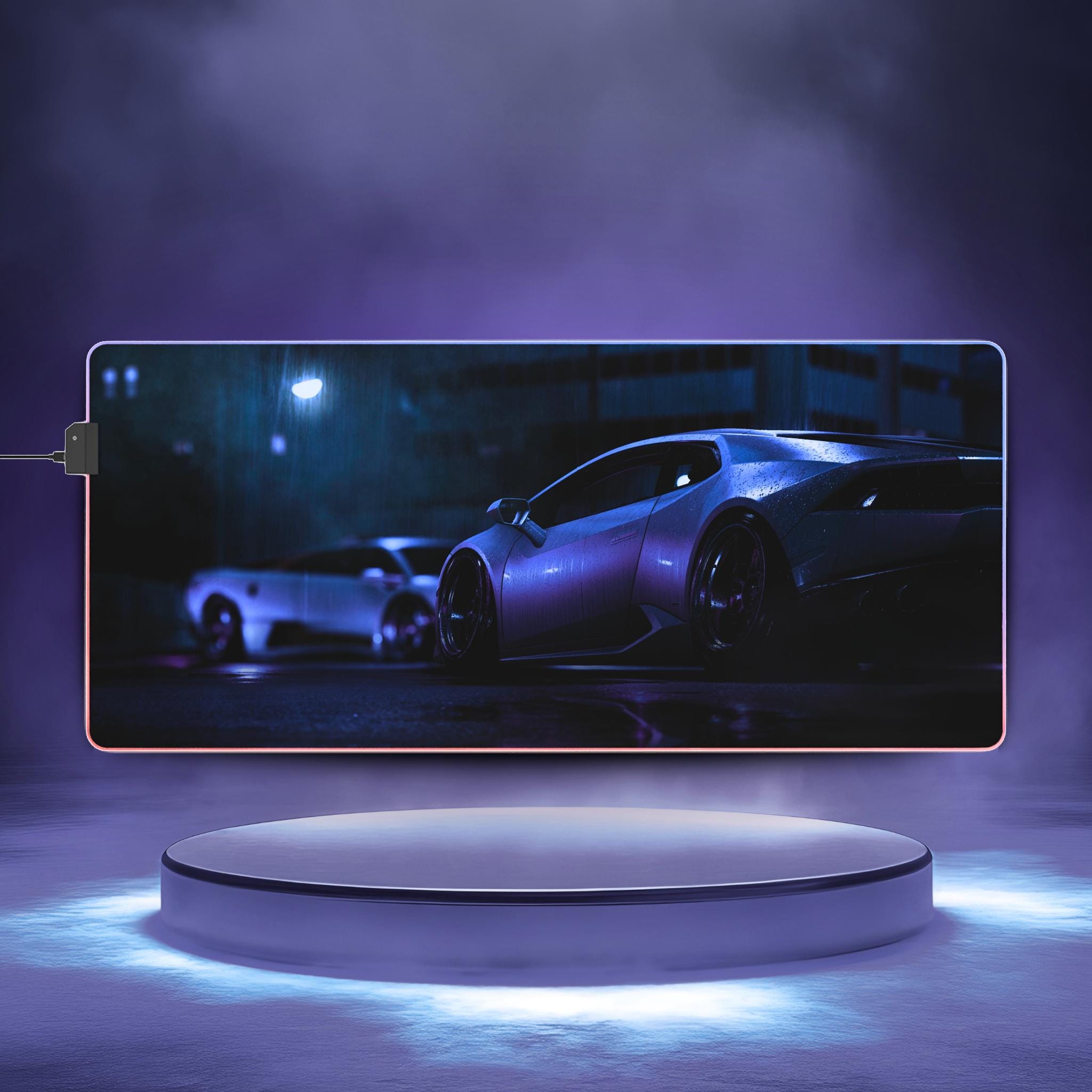 A widescreen LED gaming mouse pad that turns a desk into a late-night race. Deep, saturated print brings the car-and-city artwork to life while the subtle RGB edge light wraps the surface in shifting hues. The smooth polyester top gives low-friction tracking for mice, and the grippy rubber base keeps everything locked in place during intense sessions. Detachable USB connectivity and included cable make setup simple — plug in, pick a color, and let the pad set the mood for focused play or relaxed cruising.