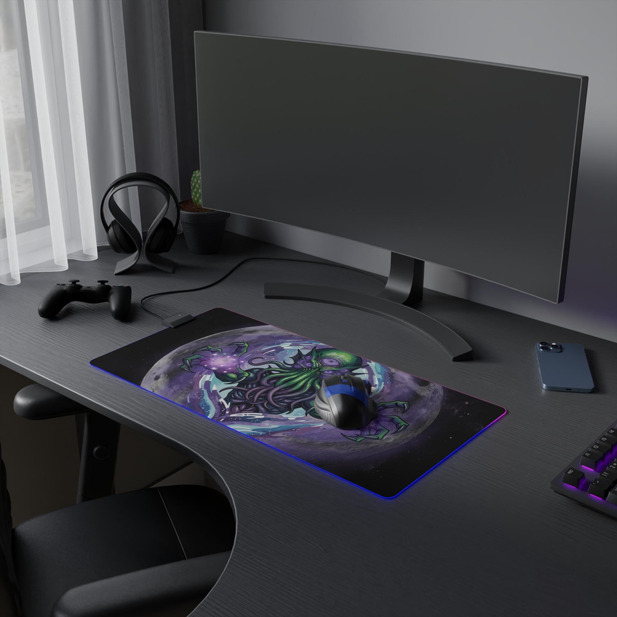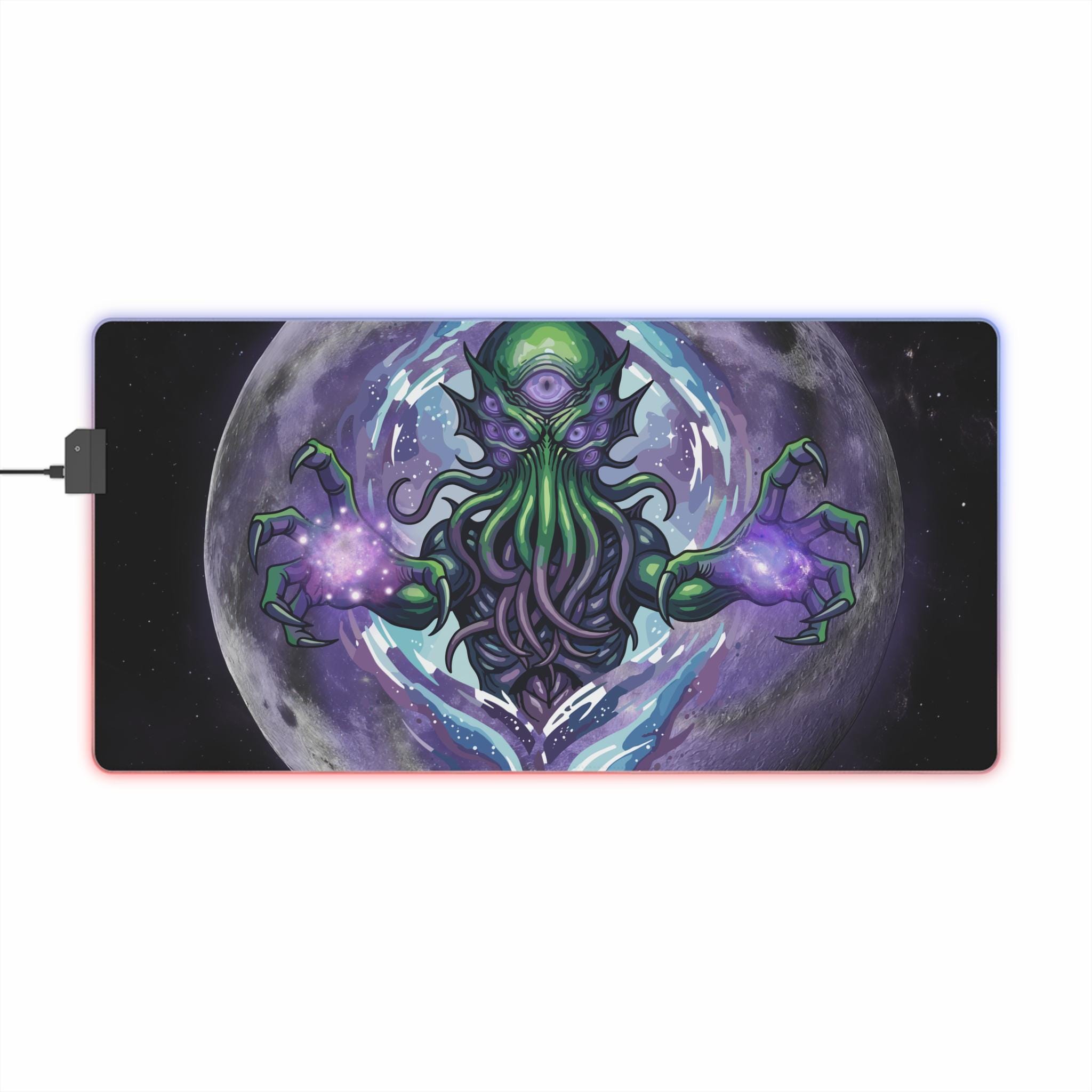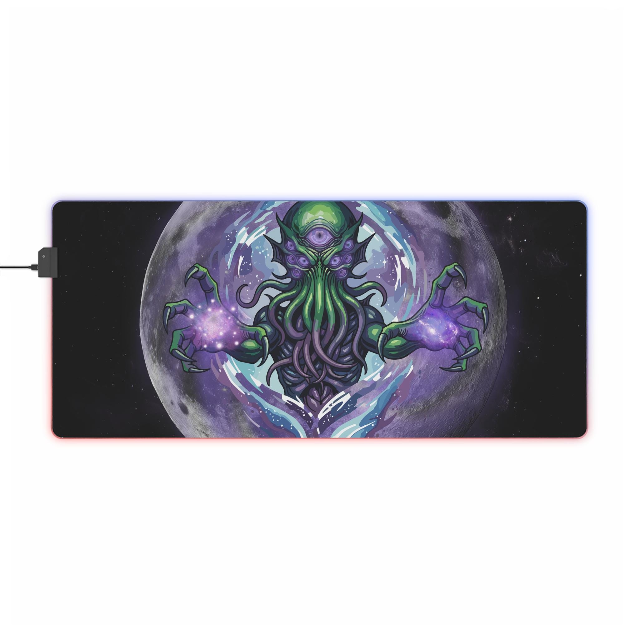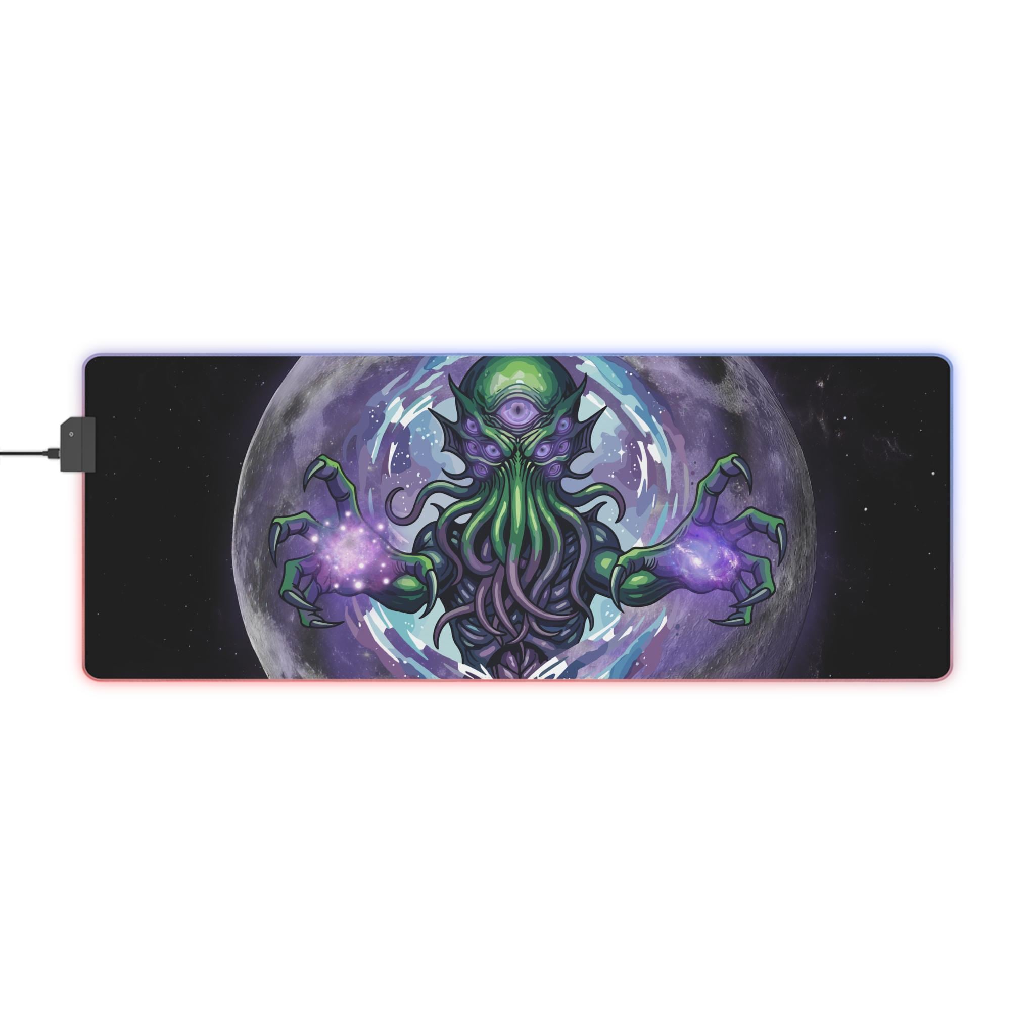 This oversized LED gaming mouse pad brings atmosphere and performance to long sessions at the desk. The surface shows a vivid, otherworldly Cthulhu-inspired illustration with deep purples and greens, while an RGB light strip around the edges bathes your setup in selectable color. The smooth polyester face gives accurate mouse tracking, and the thick rubber base keeps the mat firmly in place during intense plays. Detachable USB connection and included micro USB cable make setup simple, and the bright print resists fading so the art stays bold night after night.