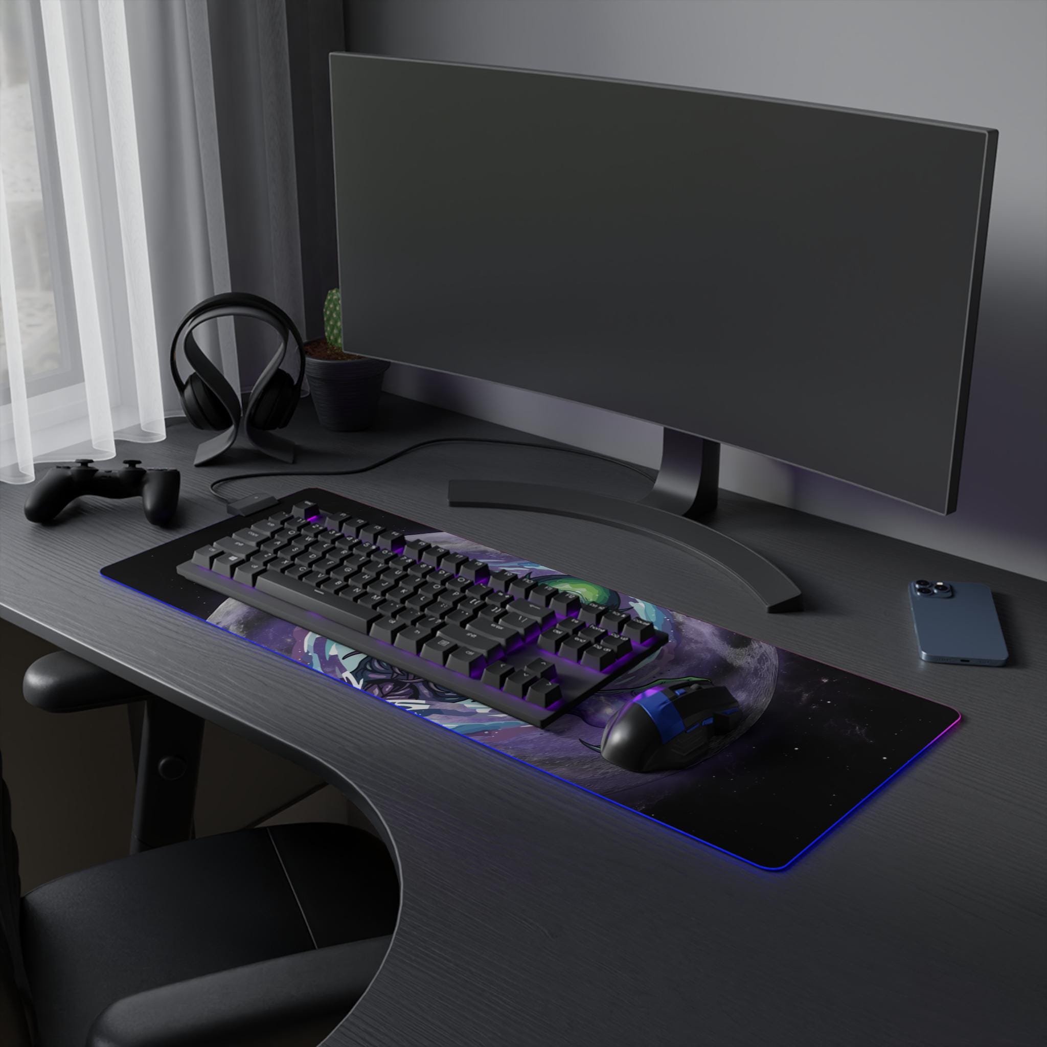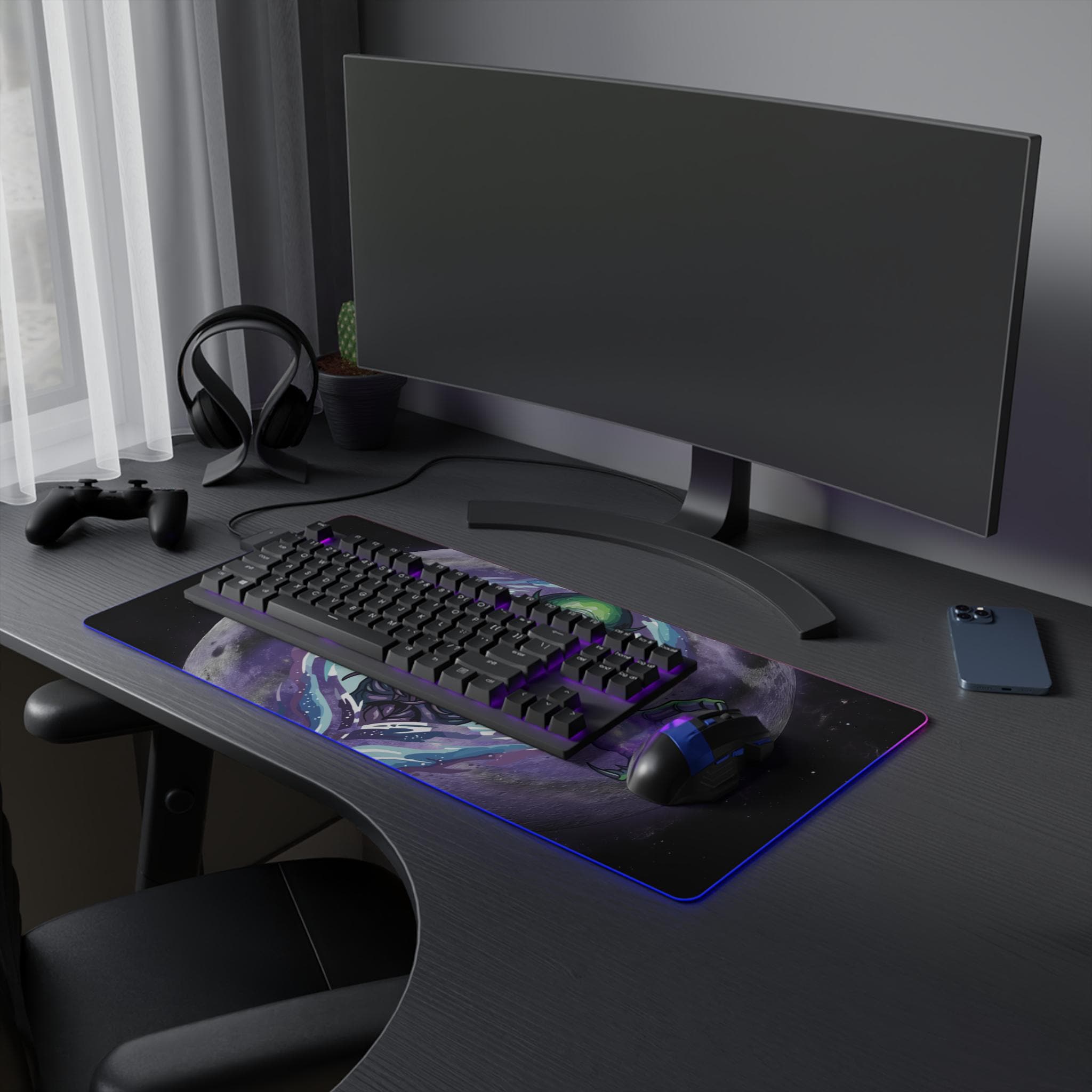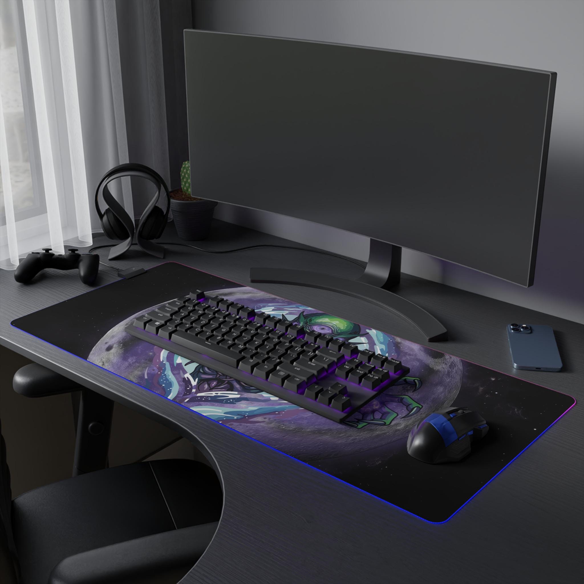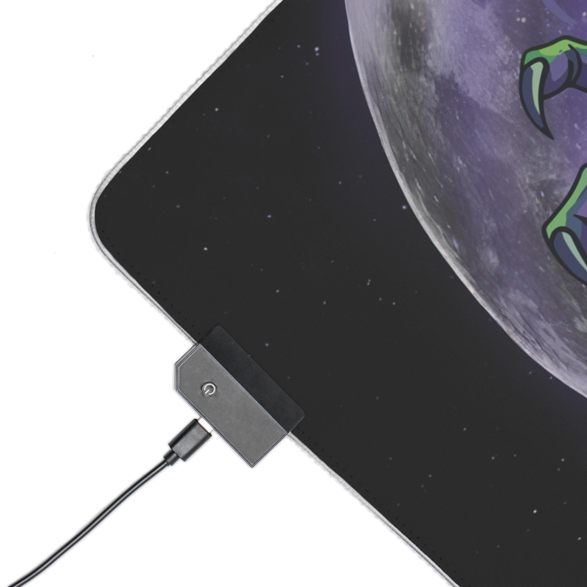 This oversized LED gaming mouse pad brings atmosphere and performance to long sessions at the desk. The surface shows a vivid, otherworldly Cthulhu-inspired illustration with deep purples and greens, while an RGB light strip around the edges bathes your setup in selectable color. The smooth polyester face gives accurate mouse tracking, and the thick rubber base keeps the mat firmly in place during intense plays. Detachable USB connection and included micro USB cable make setup simple, and the bright print resists fading so the art stays bold night after night.
