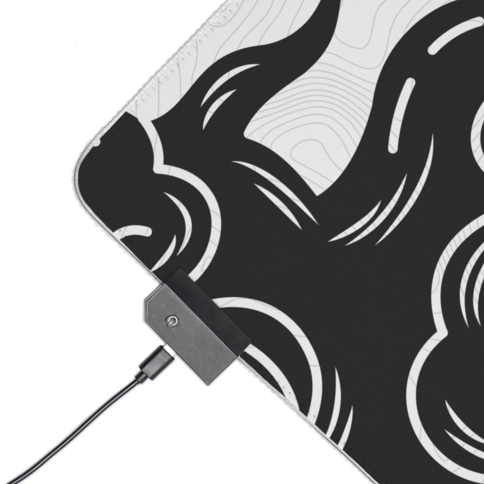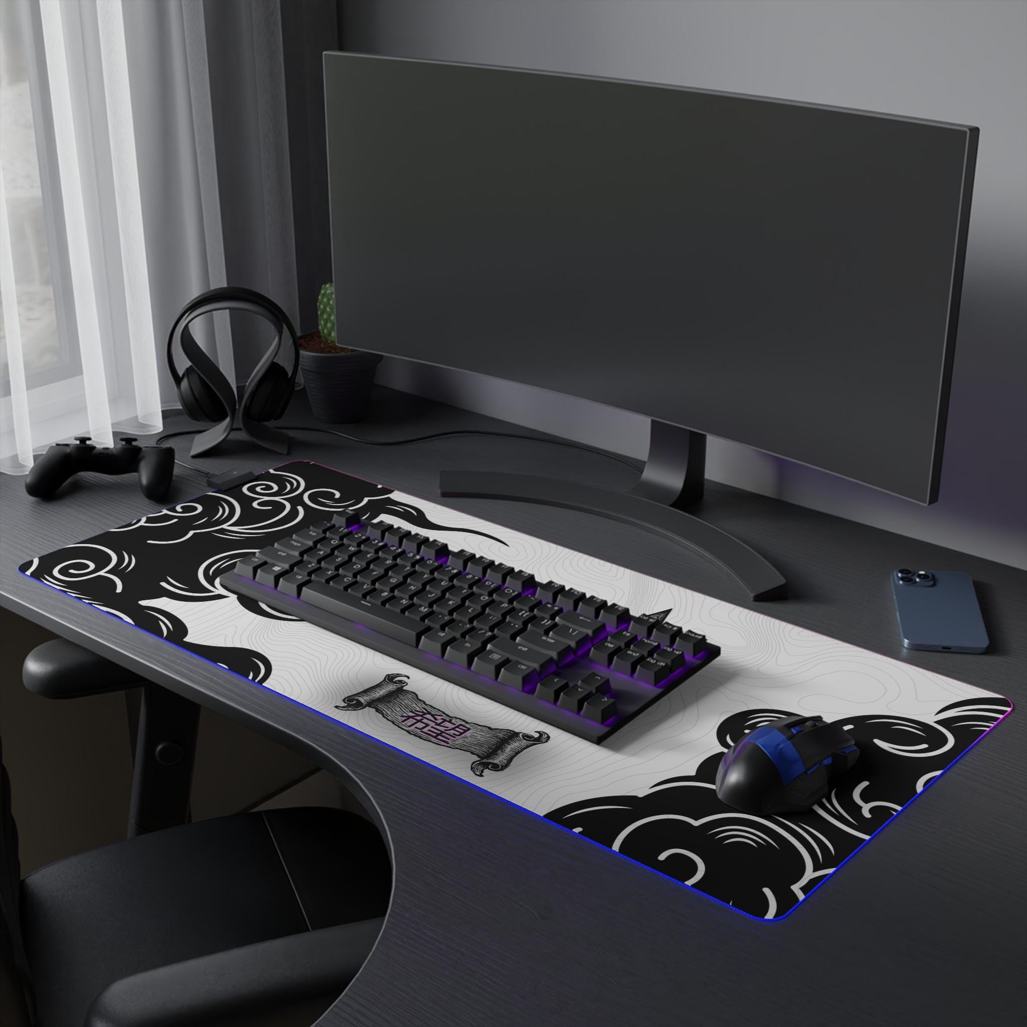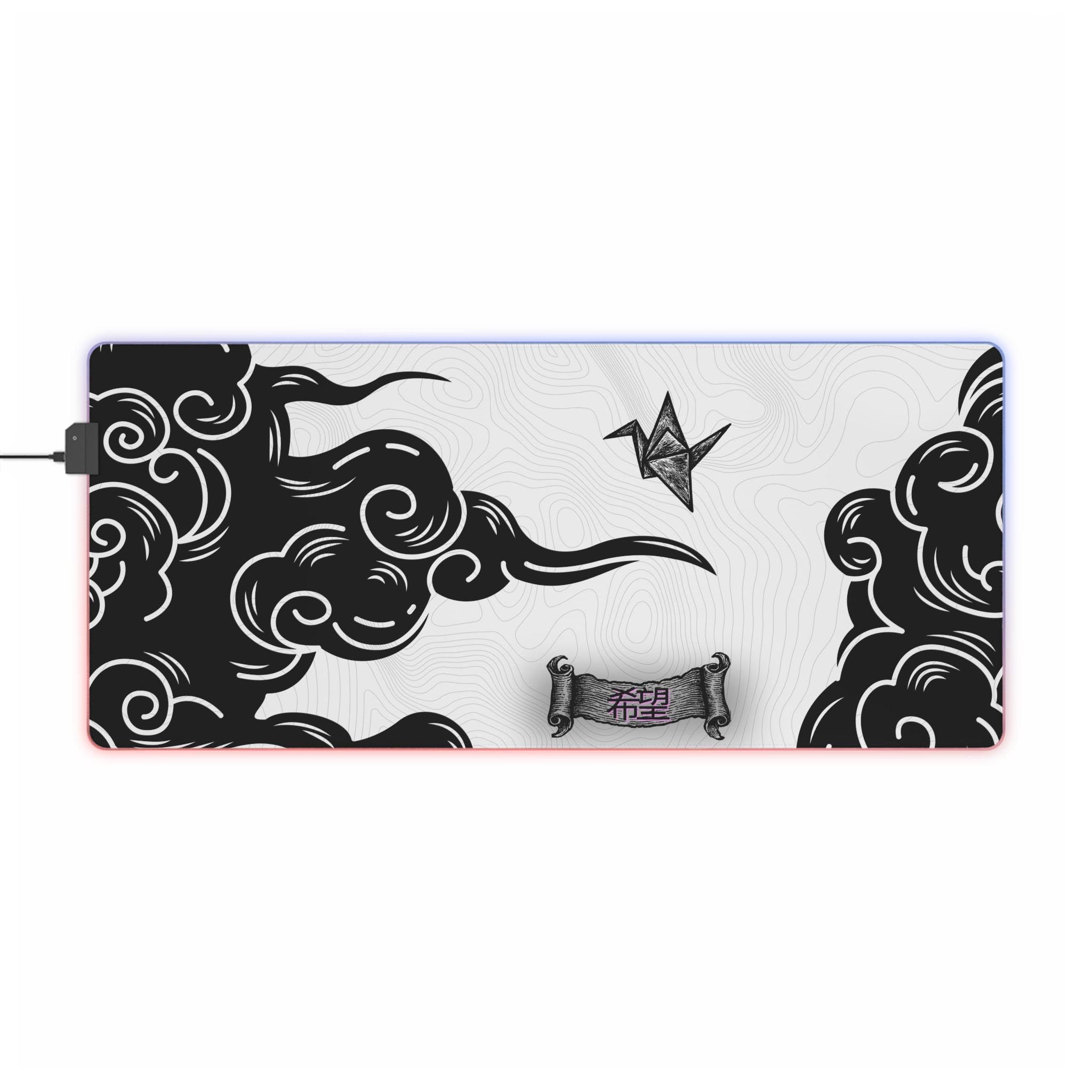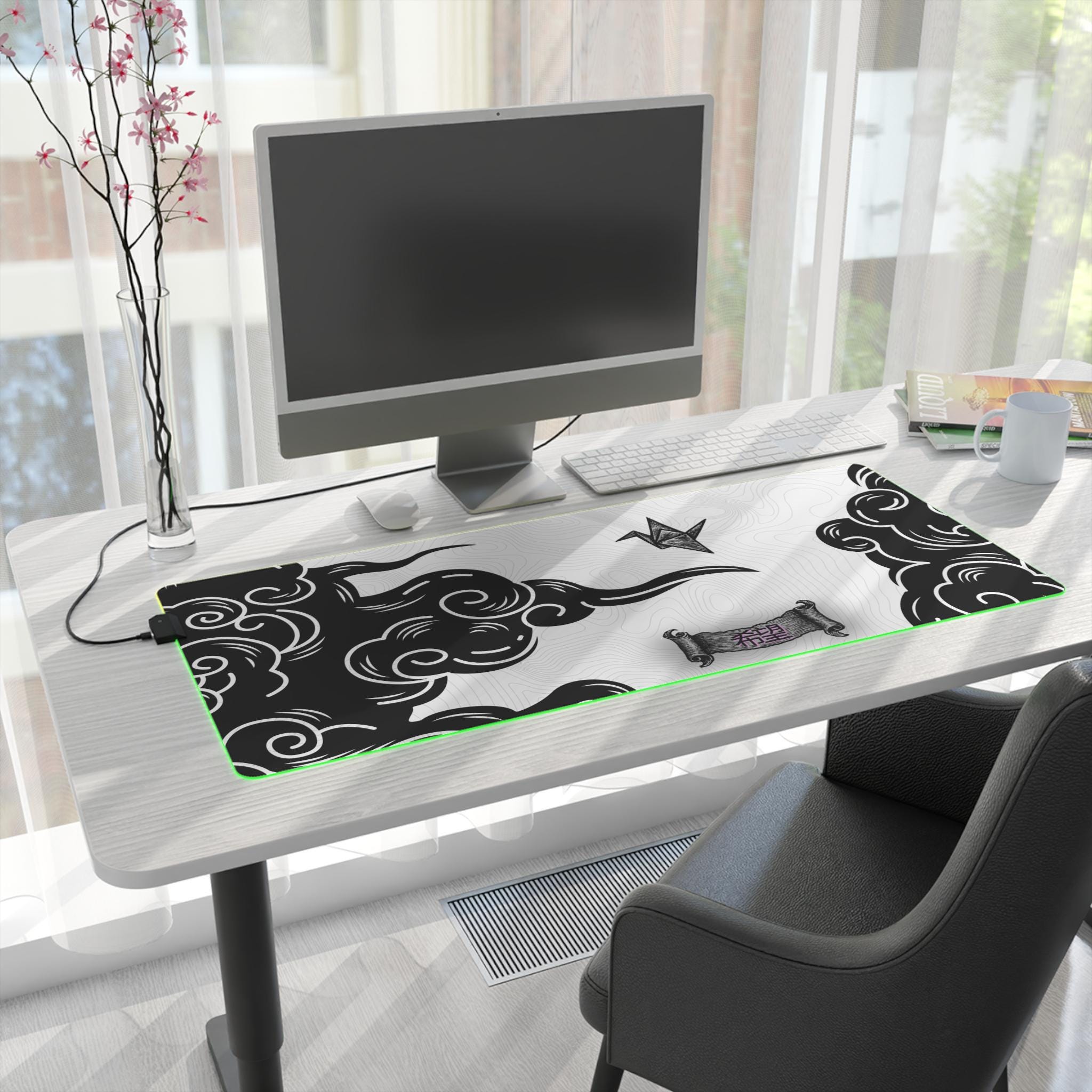 This oversized LED gaming mouse pad brings atmosphere to your desk — a wide, smooth surface printed with high-contrast inkwork and framed by a soft, color-shifting LED edge. The textured polyester top gives consistent mouse glide and crisp tracking for precise aim, while the thick rubber base keeps the pad anchored during long sessions. Plug in the detachable USB cable and cycle through seven vivid LED tones to match your rig or set the mood for a late-night run. It's built for focused players who want both performance and personality on their battle station.