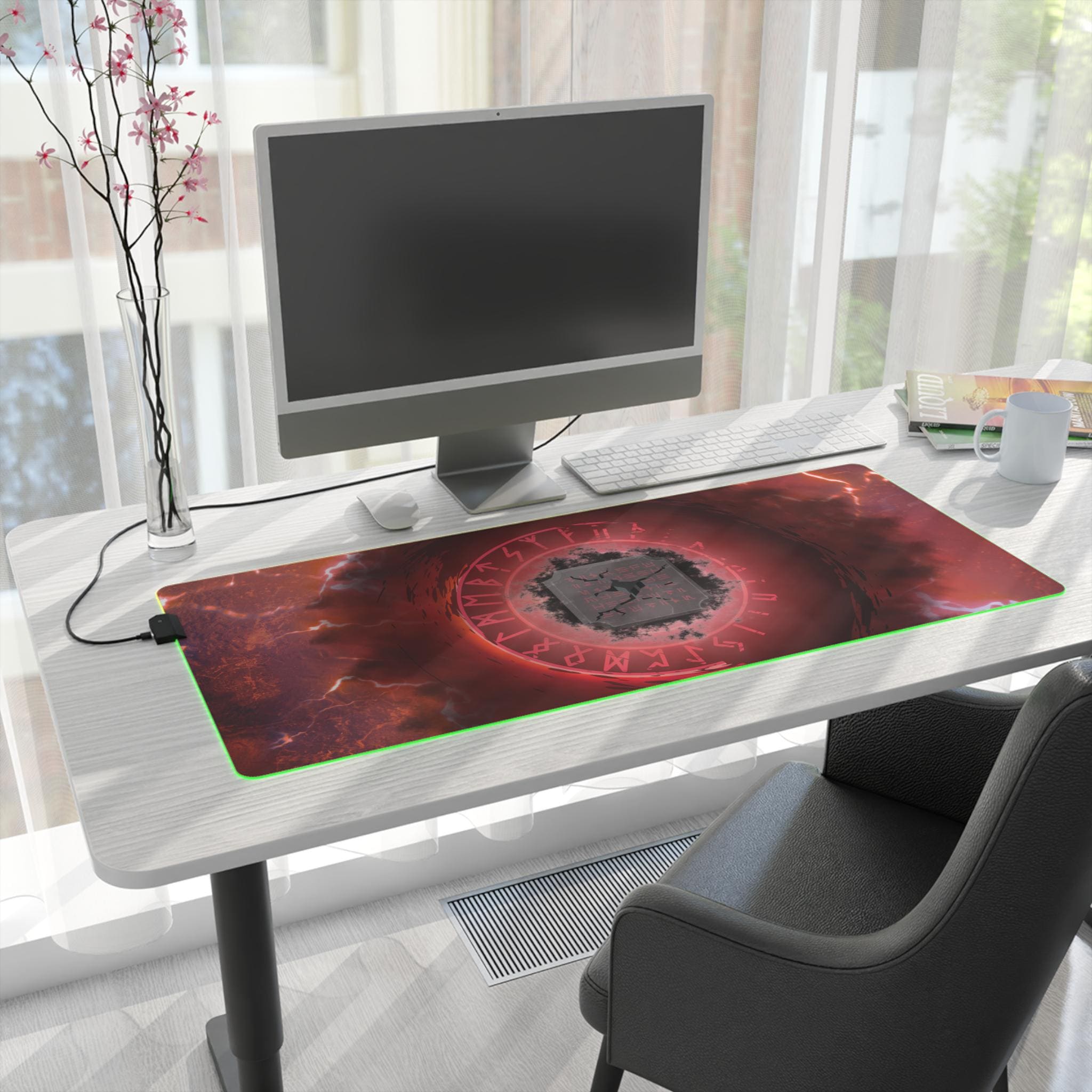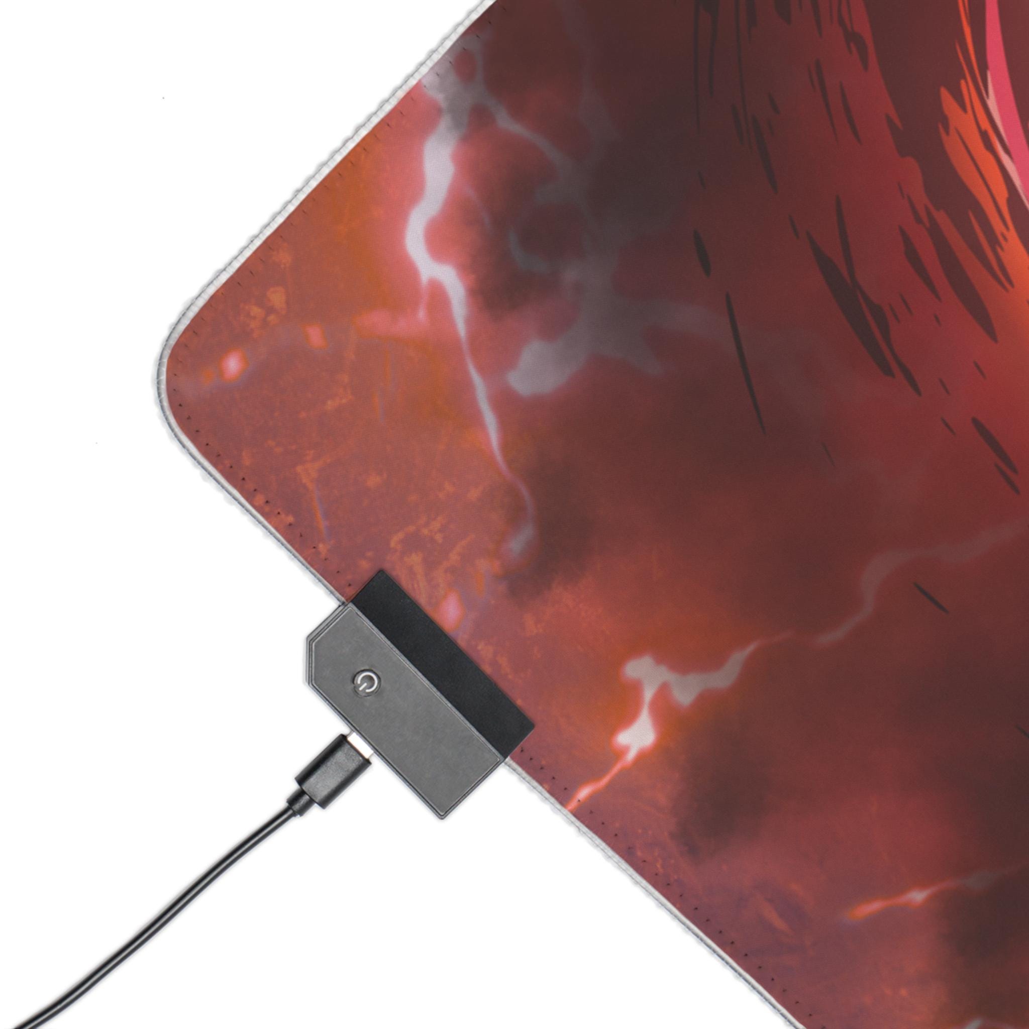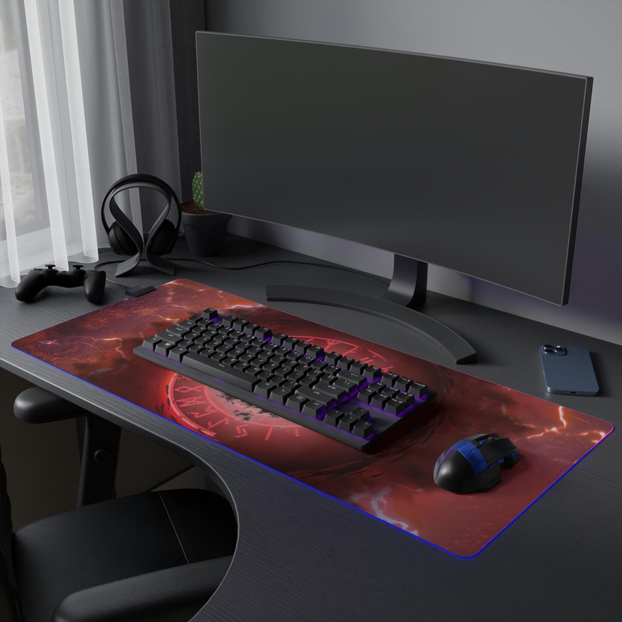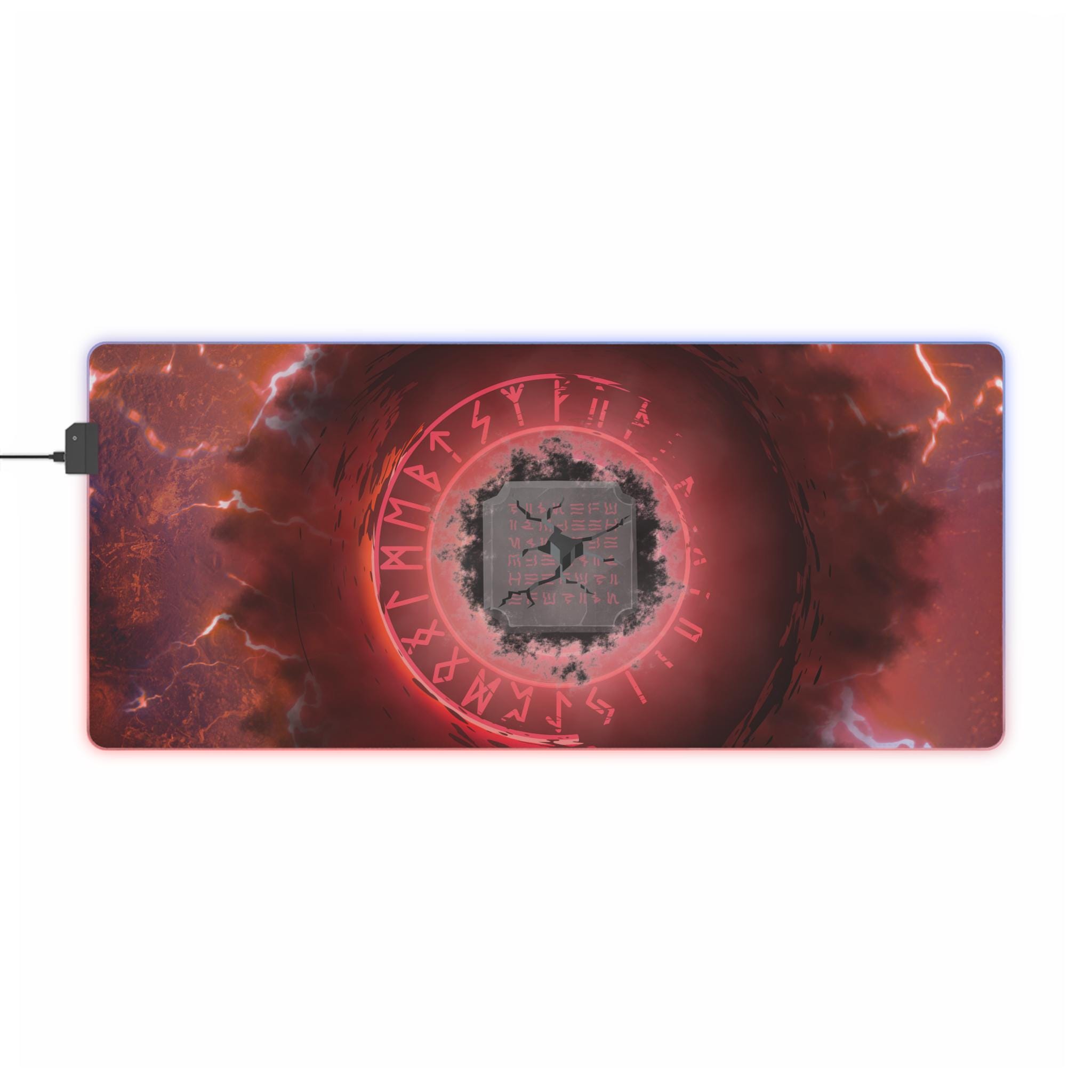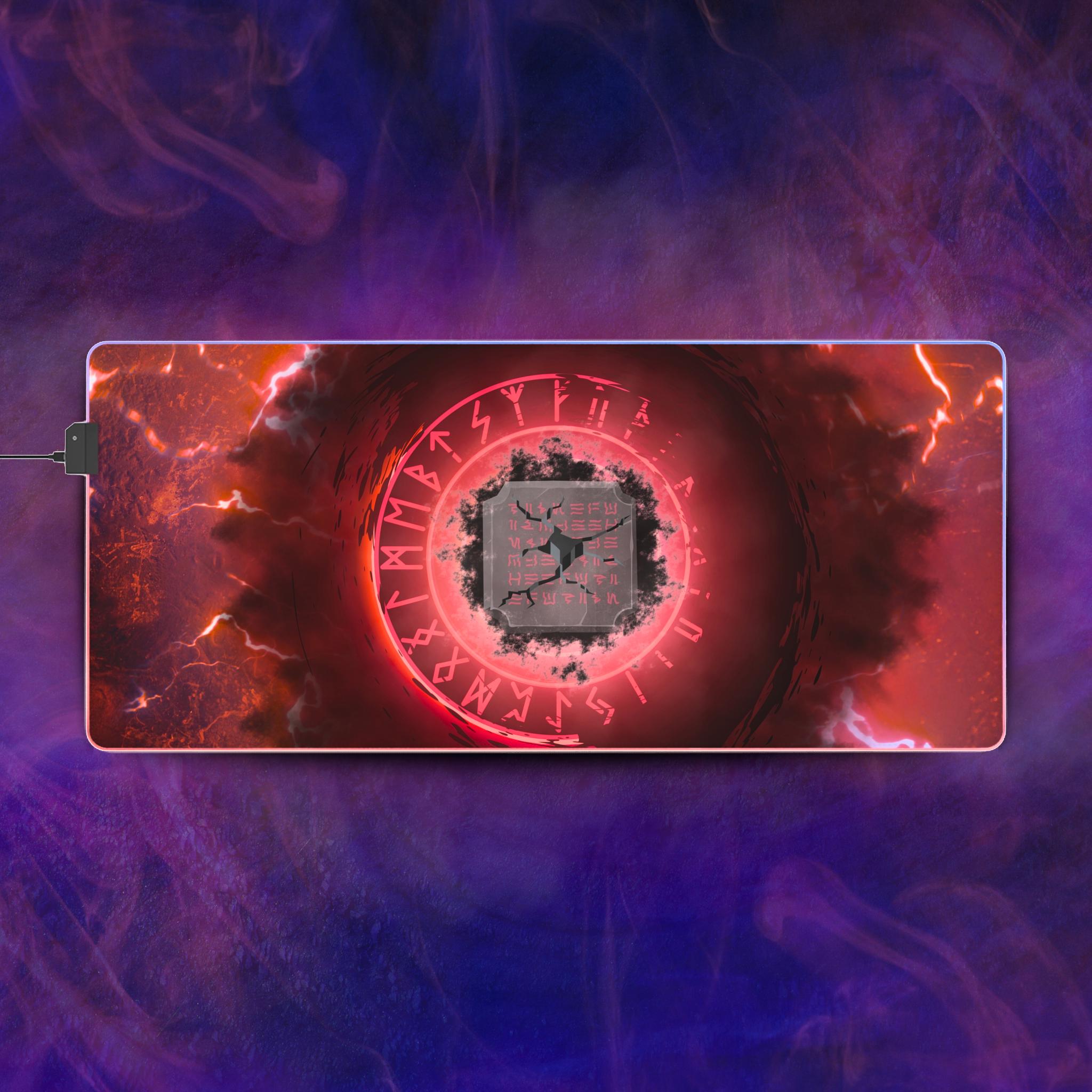 A sprawling RGB mouse pad that glows beneath your setup and anchors intense sessions. The surface shows a stormy, rune-ringed design in deep reds and ash grays — like a sigil-lit battlefield frozen in a flash of lightning. Soft polyester up top keeps sensors tracking smoothly while the wide format gives room for broad, low-sensitivity swipes. An edge LED strip cycles through vivid colors or locks to a single tone via the included detachable micro USB cable. The rubberized base grips your desk so the pad stays put through fast flicks and long raids. It's built for players who want atmosphere and dependable performance without extra bulk.