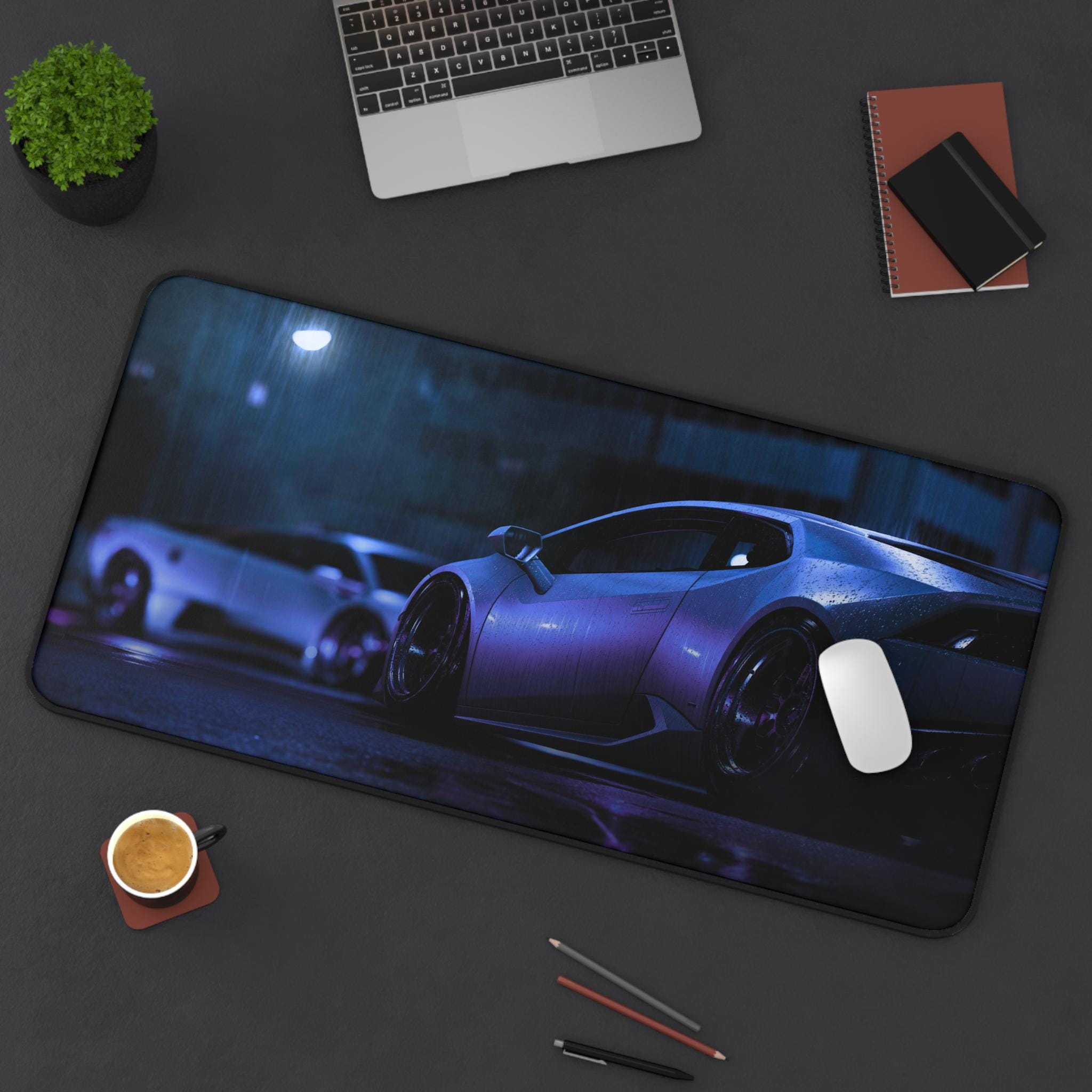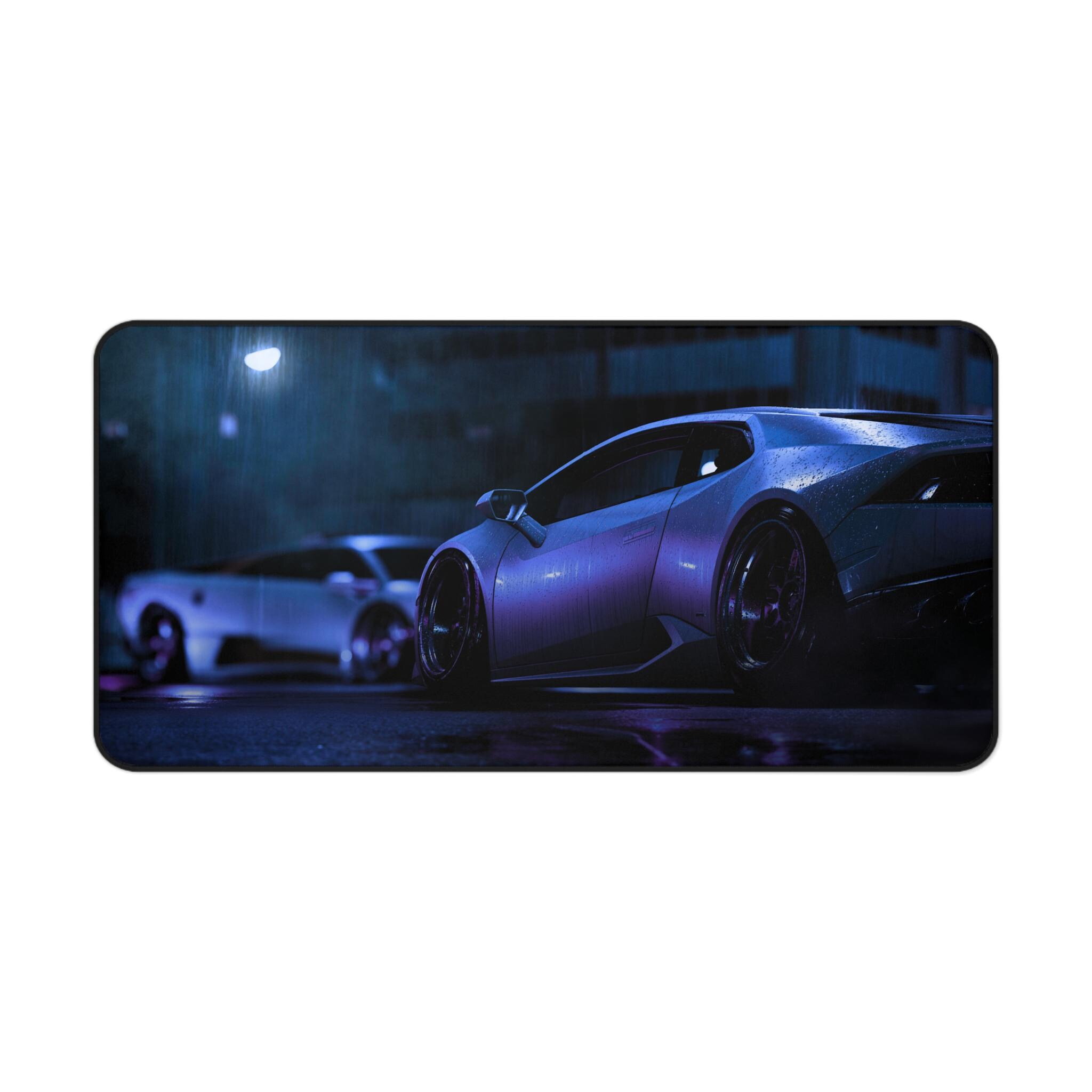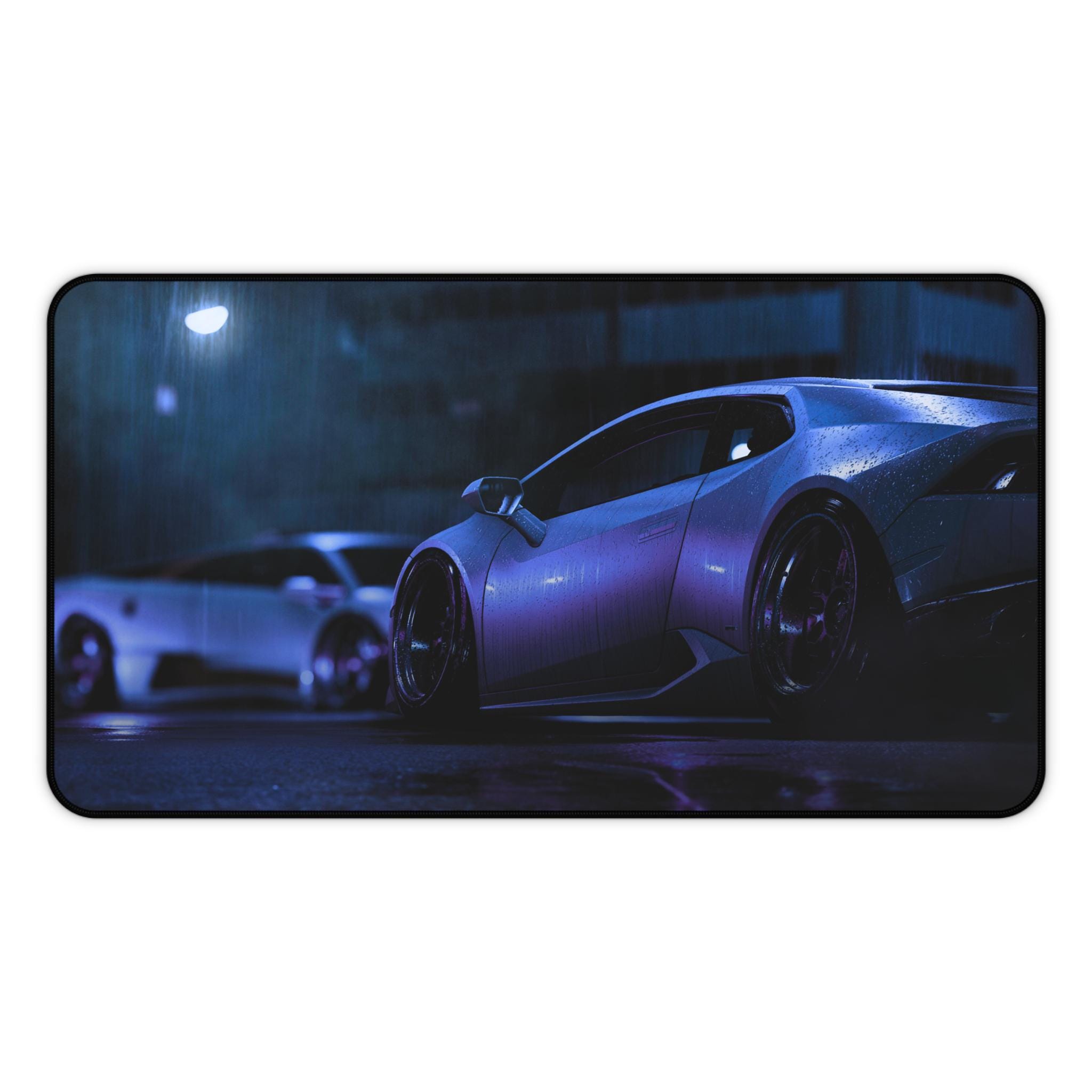A wide neoprene desk mat that brings late-night street racing vibes to your workspace. Deep purples and cool blues shimmer across a sleek sports car print, turning any desk into a focused, atmospheric space for work, gaming, or creative projects. The textured, anti-slip backing keeps the mat anchored during intense typing sessions or quick mouse flicks. Hemmed edges stand up to daily use, and the smooth surface showcases vibrant colors with crisp, detailed printing. Available in three sizes to fit cramped desks or sprawling setups, this mat supports writing, crafting, and precision mouse control while adding a cinematic, high-performance feel to your environment.