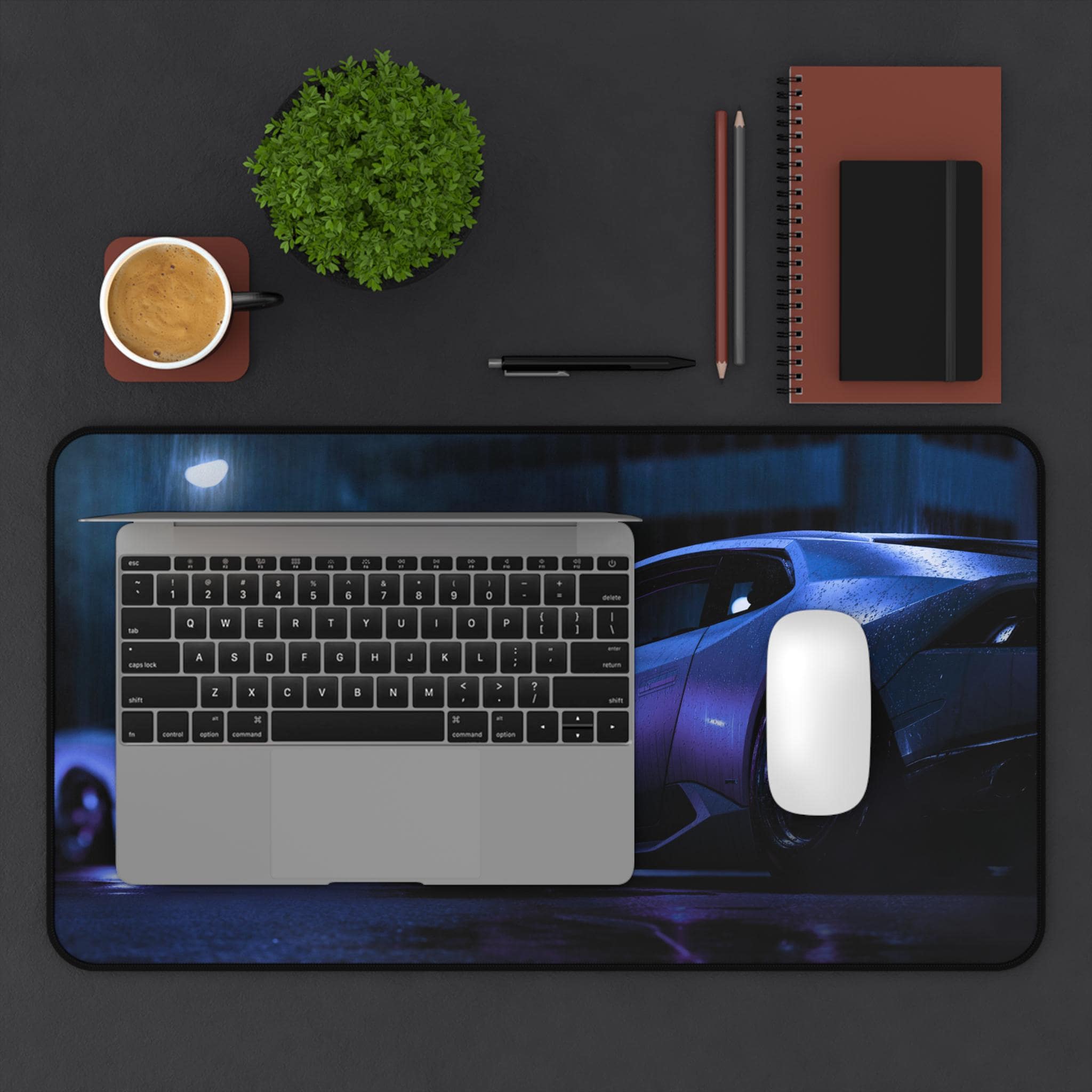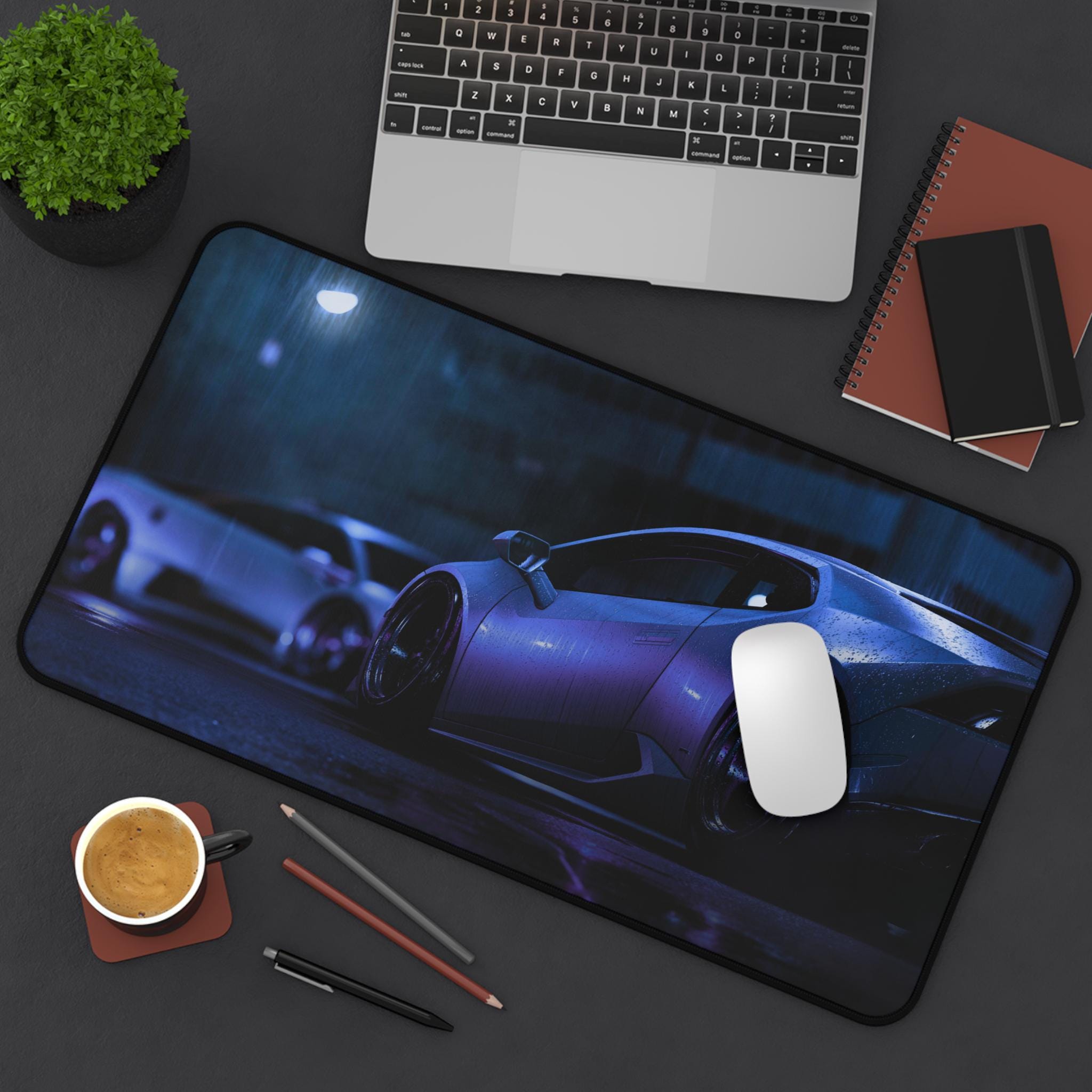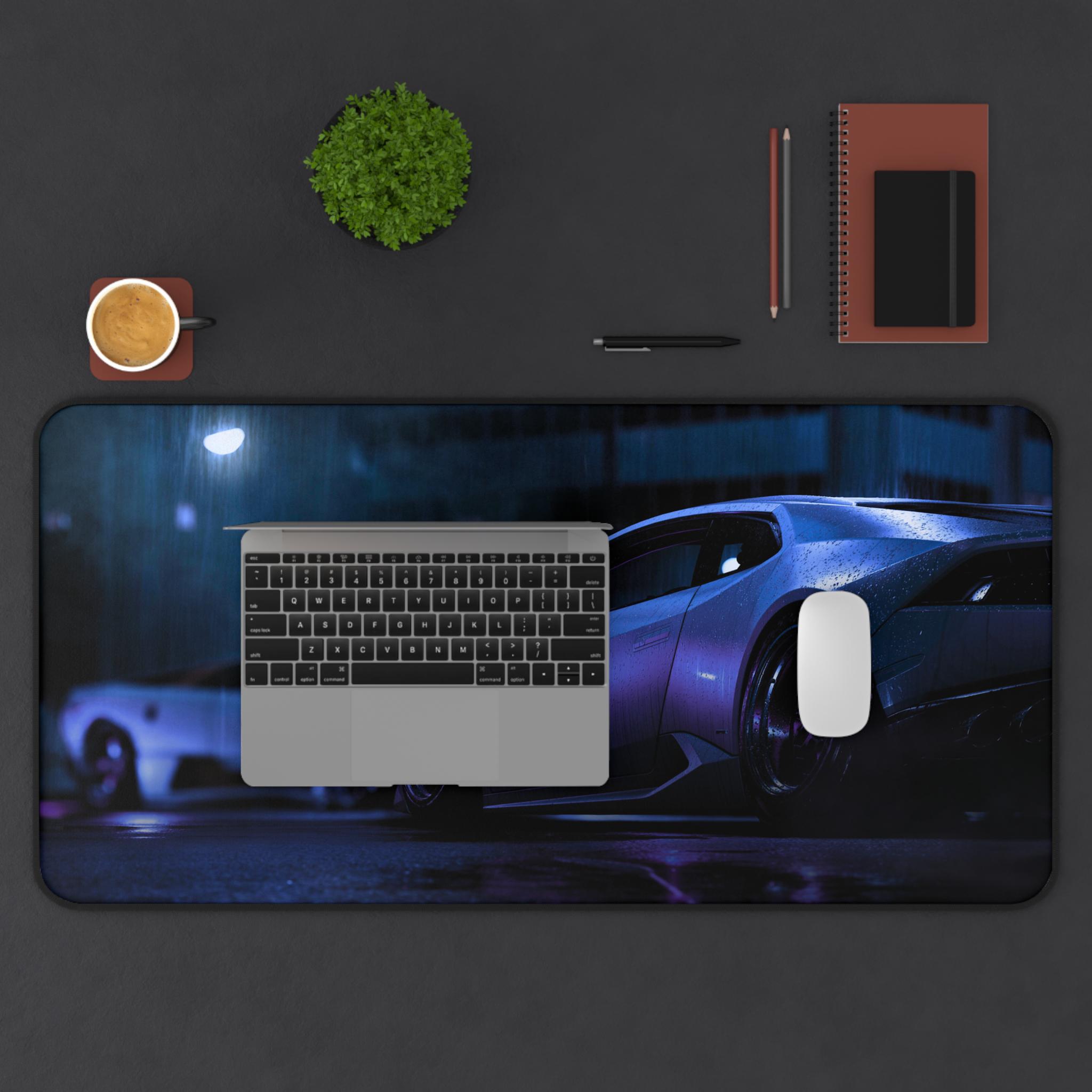 A wide neoprene desk mat that brings late-night street racing vibes to your workspace. Deep purples and cool blues shimmer across a sleek sports car print, turning any desk into a focused, atmospheric space for work, gaming, or creative projects. The textured, anti-slip backing keeps the mat anchored during intense typing sessions or quick mouse flicks. Hemmed edges stand up to daily use, and the smooth surface showcases vibrant colors with crisp, detailed printing. Available in three sizes to fit cramped desks or sprawling setups, this mat supports writing, crafting, and precision mouse control while adding a cinematic, high-performance feel to your environment.