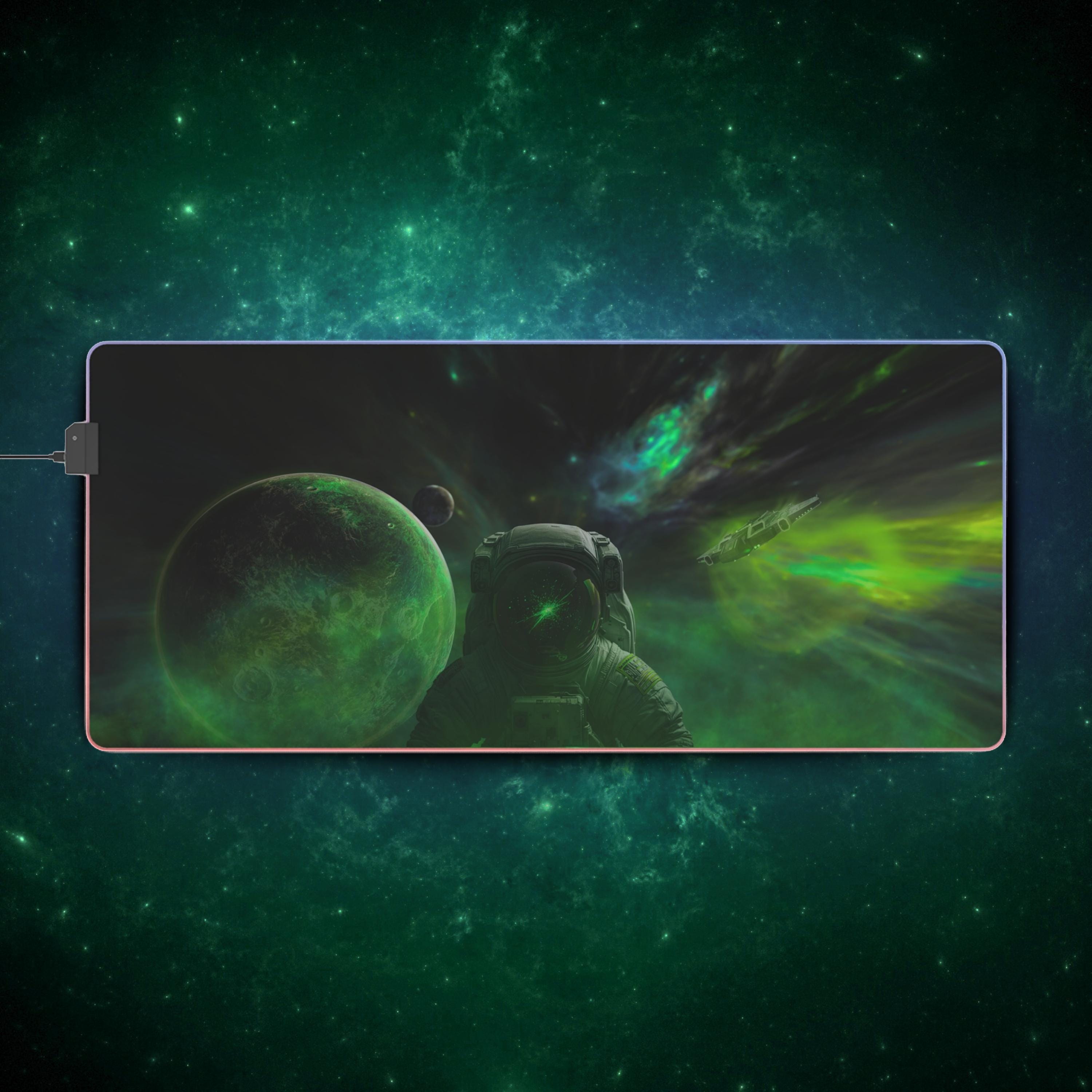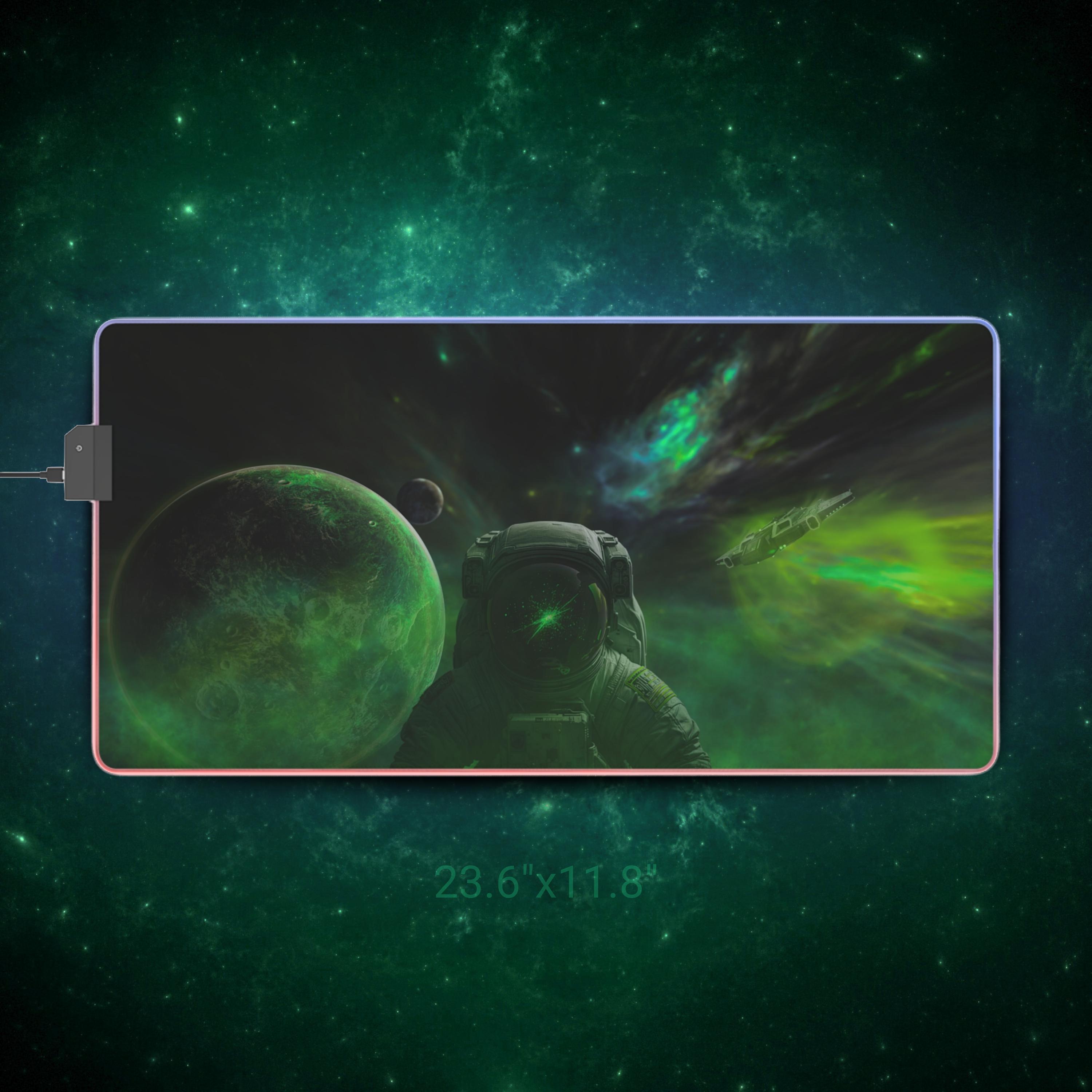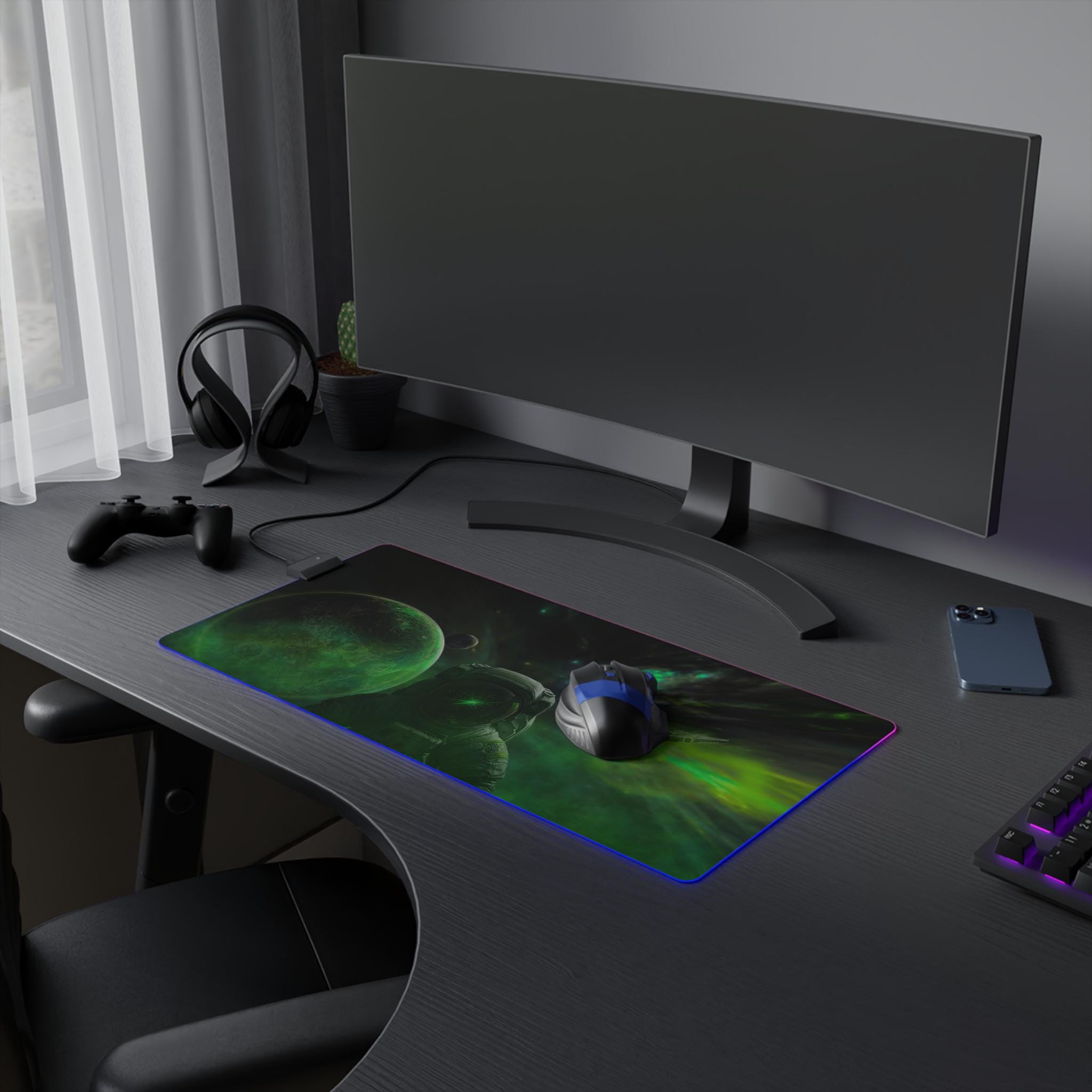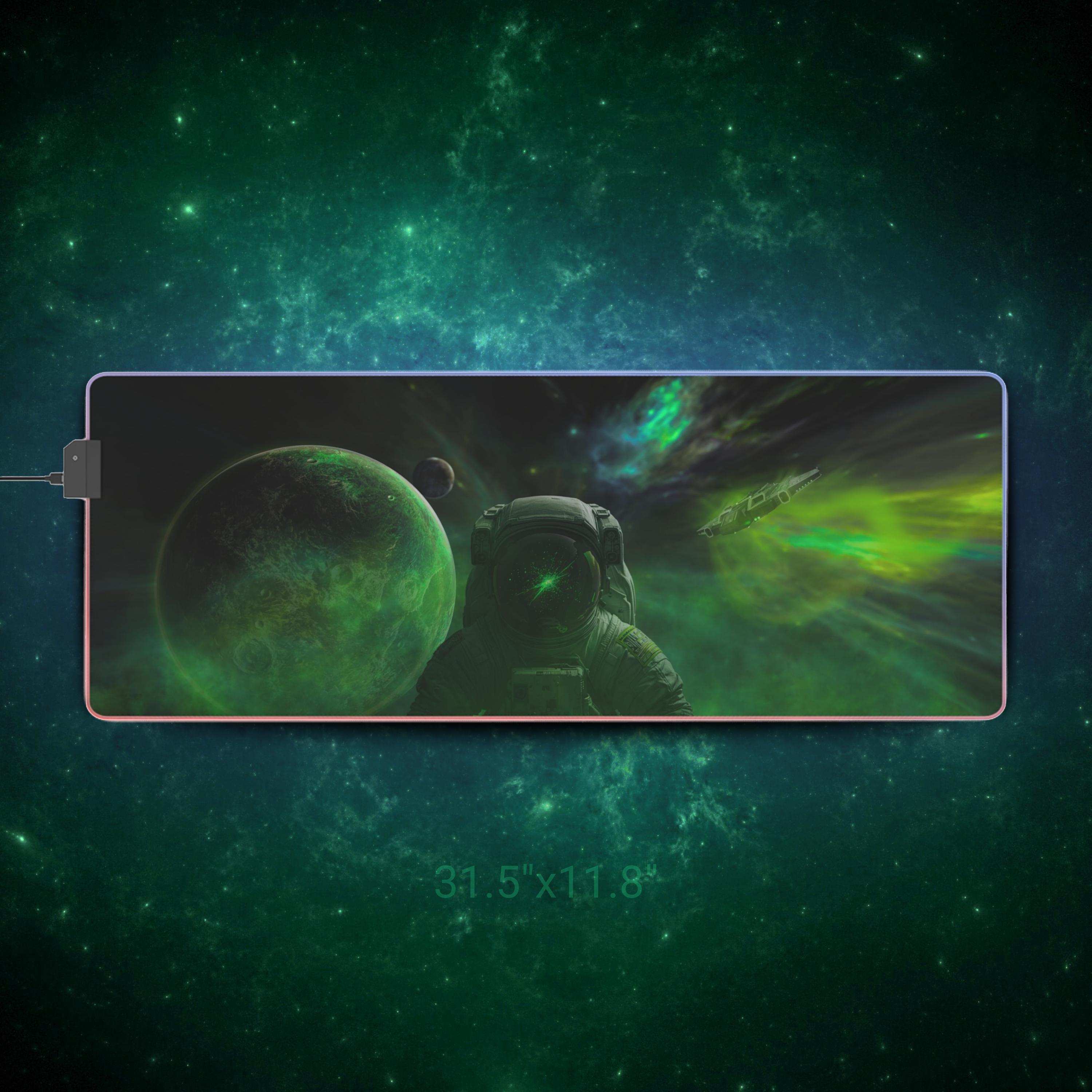 Stretching edge to edge, this LED gaming mouse pad turns your desk into a midnight sky. The deep-space artwork — drifting planets, a lone astronaut, and swirling green auroras — draws you into long sessions of focused play or late-night creative work. A smooth 100% polyester surface ensures precise mouse tracking, while the full-edge RGB LED strip bathes the scene in selectable color washes. The thick rubber base keeps the pad firmly in place through frantic swipes, and the detachable micro-USB connector makes setup and storage simple. It's made for people who want their battlestation to feel immersive: dim the room, pick a hue, and let the nebula pull you into the mission.