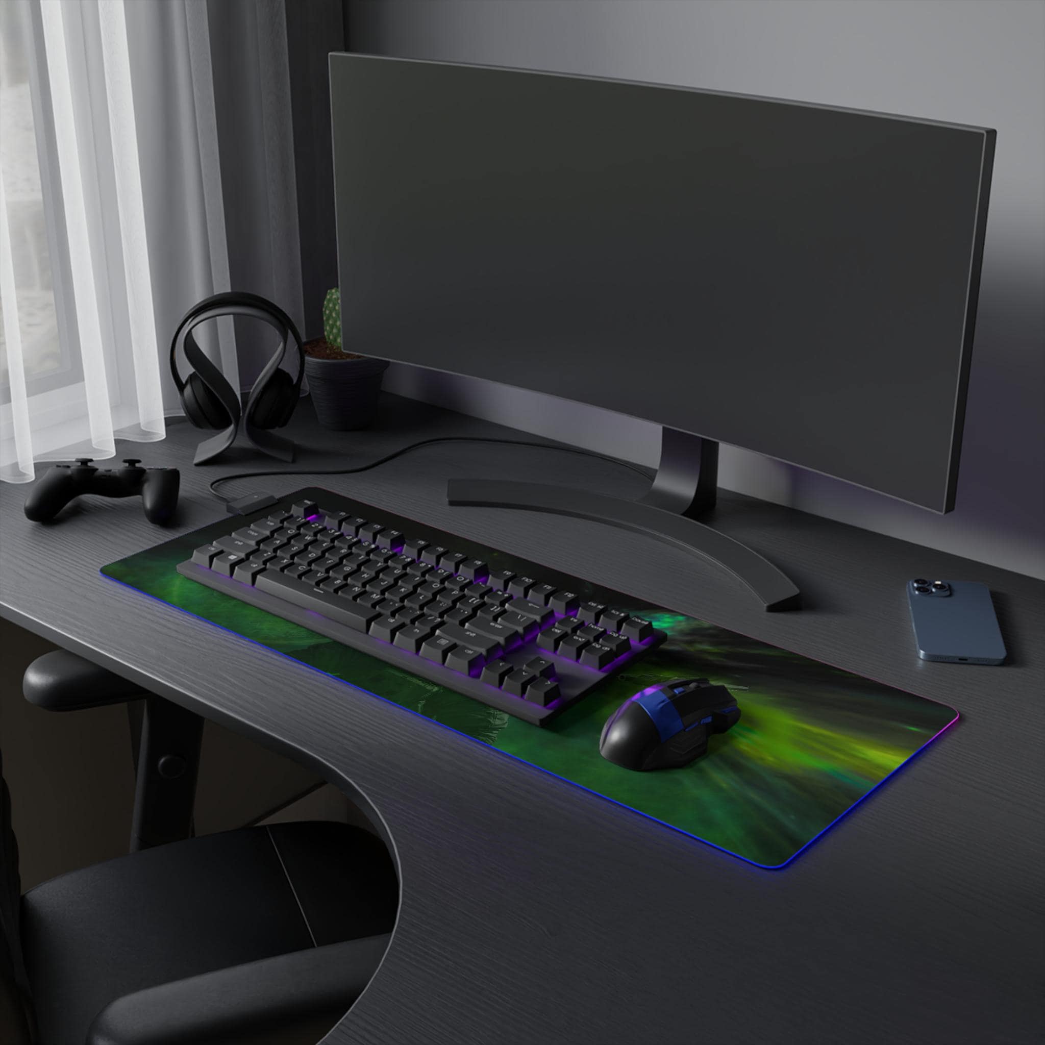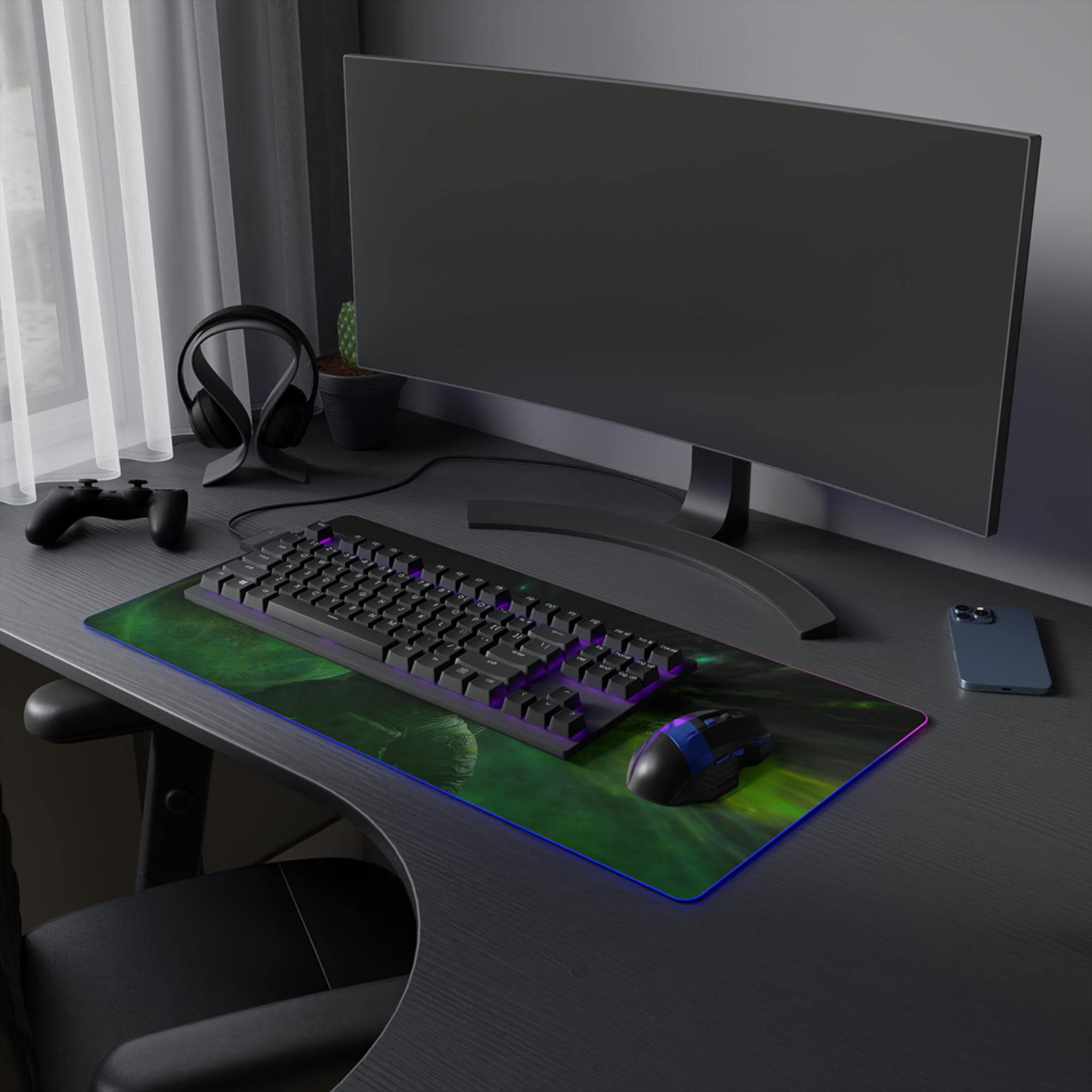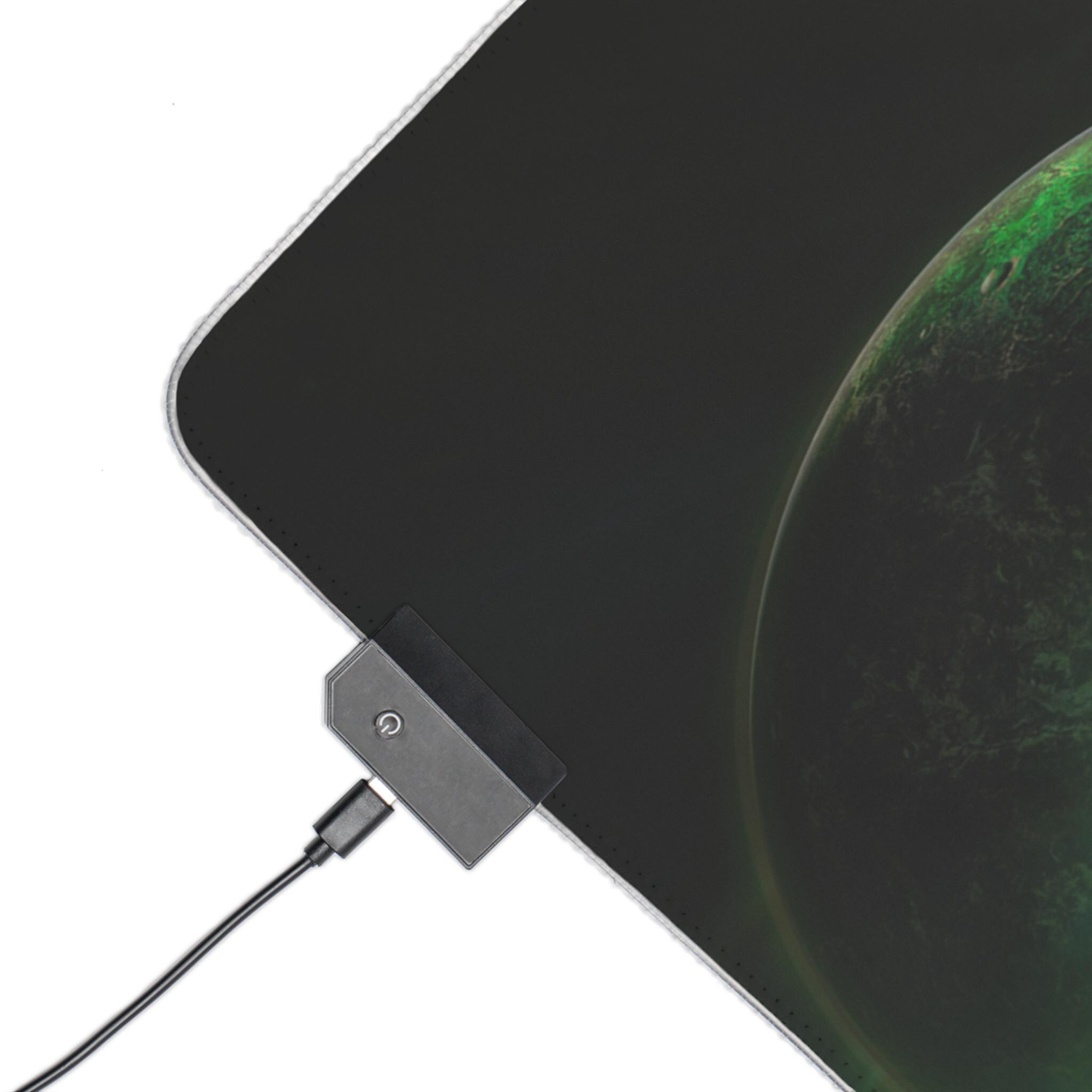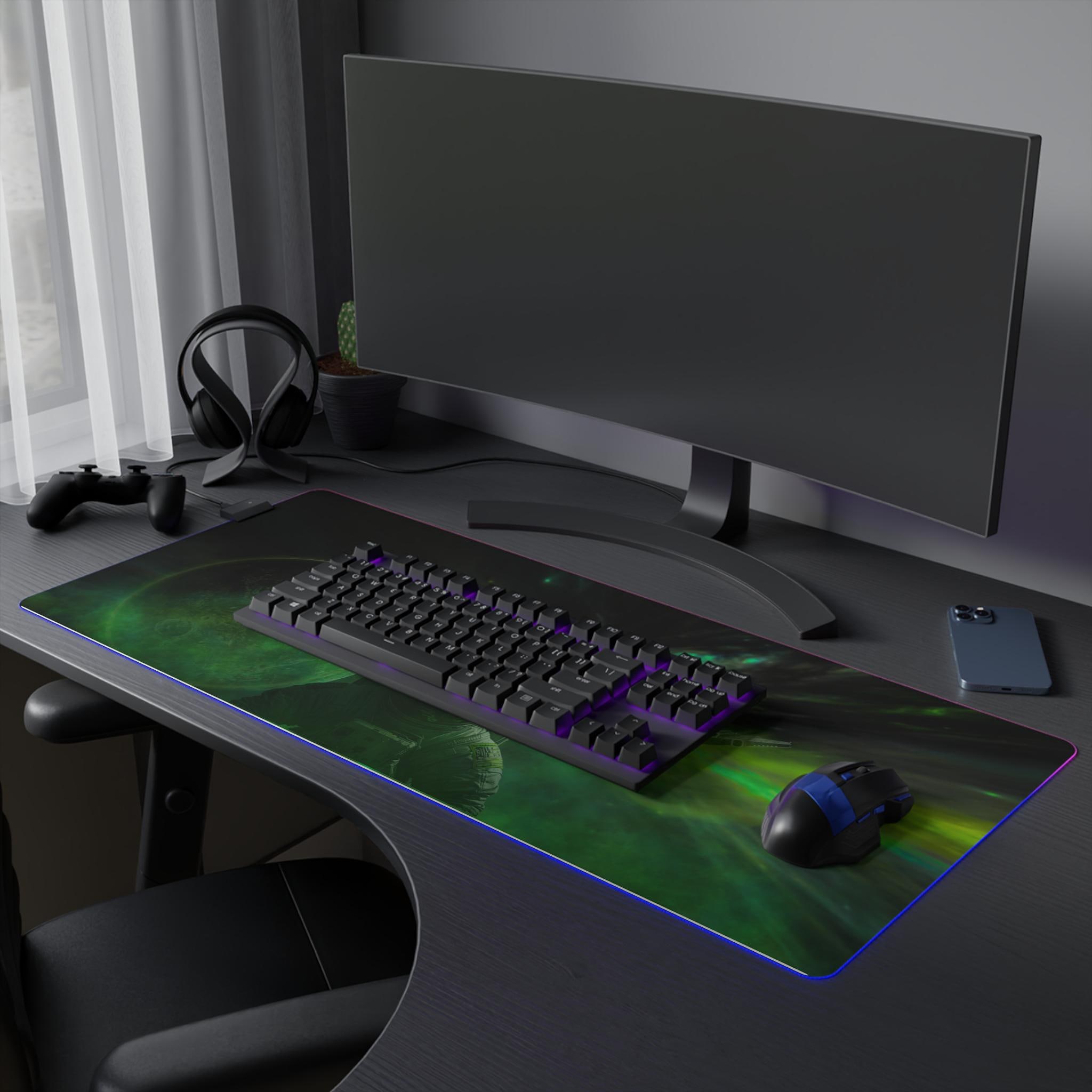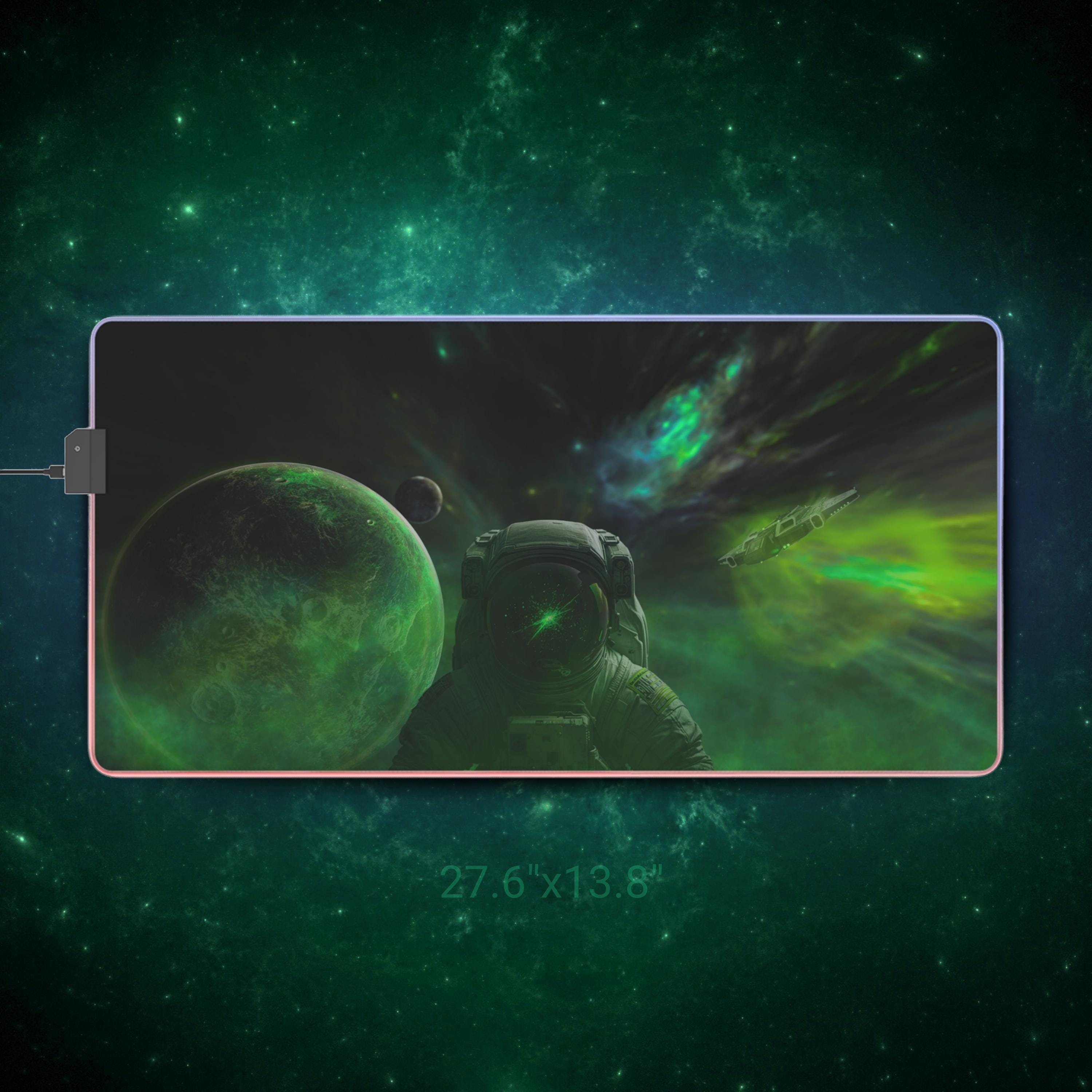 Stretching edge to edge, this LED gaming mouse pad turns your desk into a midnight sky. The deep-space artwork — drifting planets, a lone astronaut, and swirling green auroras — draws you into long sessions of focused play or late-night creative work. A smooth 100% polyester surface ensures precise mouse tracking, while the full-edge RGB LED strip bathes the scene in selectable color washes. The thick rubber base keeps the pad firmly in place through frantic swipes, and the detachable micro-USB connector makes setup and storage simple. It's made for people who want their battlestation to feel immersive: dim the room, pick a hue, and let the nebula pull you into the mission.